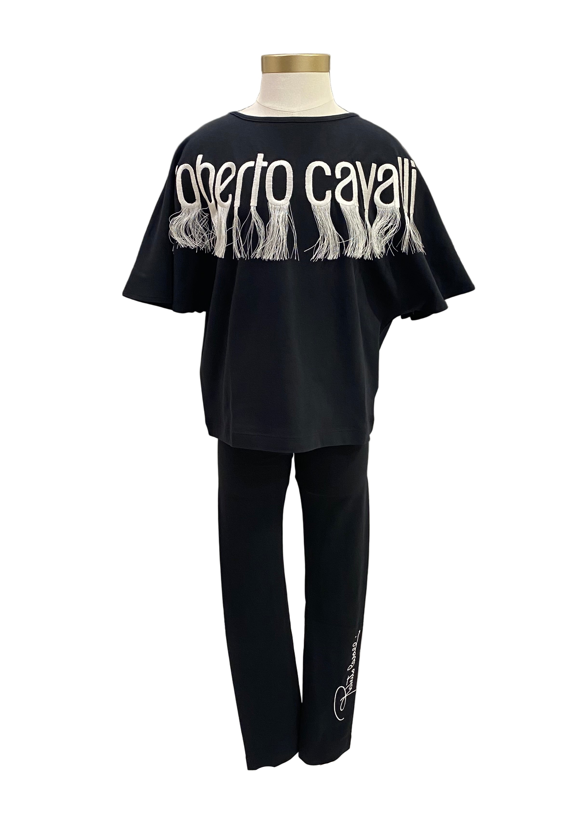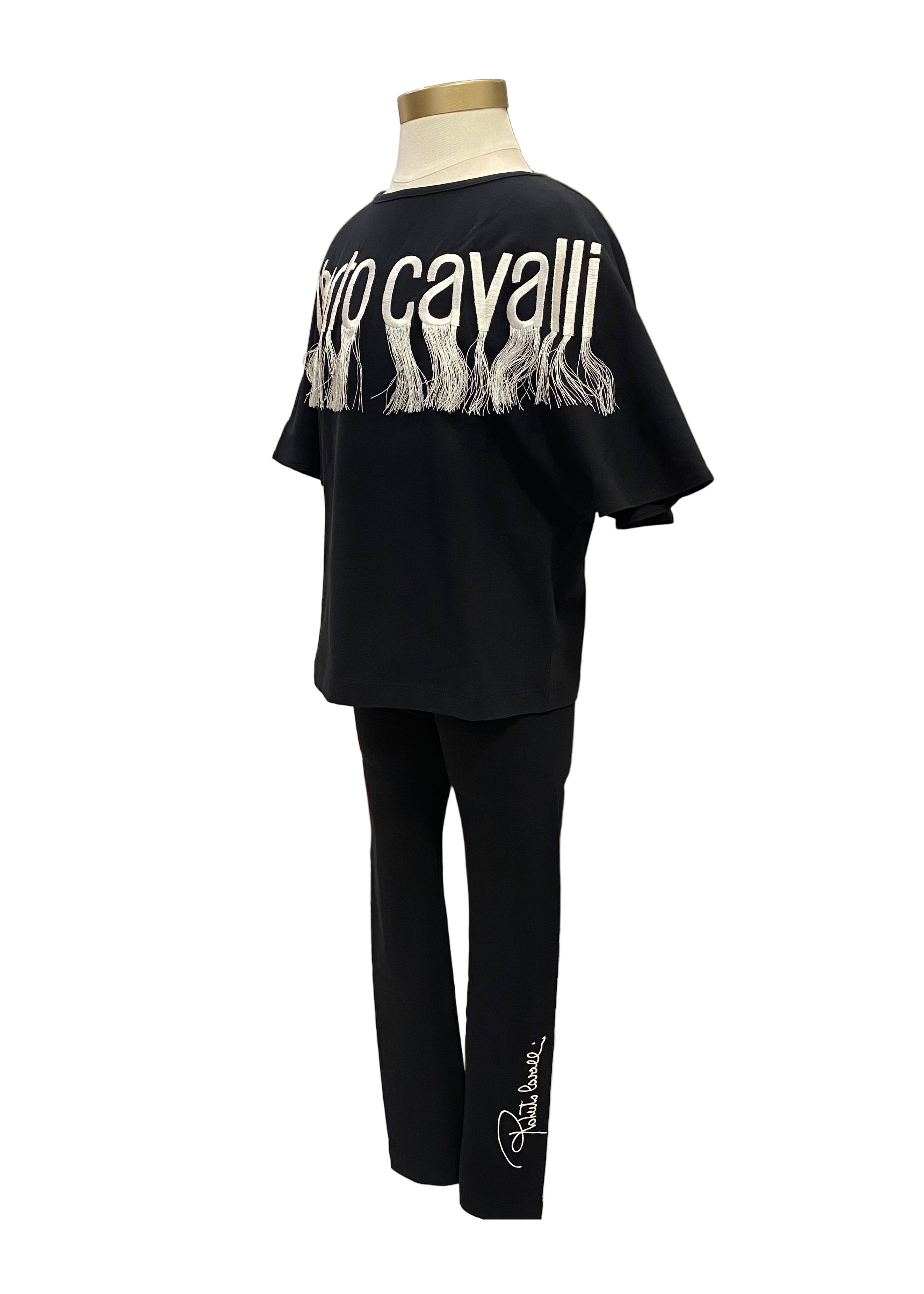Cool, chic girl's outfit. This set comes with a wide top designed with 'roberto cavalli' embroidery with tassel. The top is matched with a legging that has brand name embroidery.