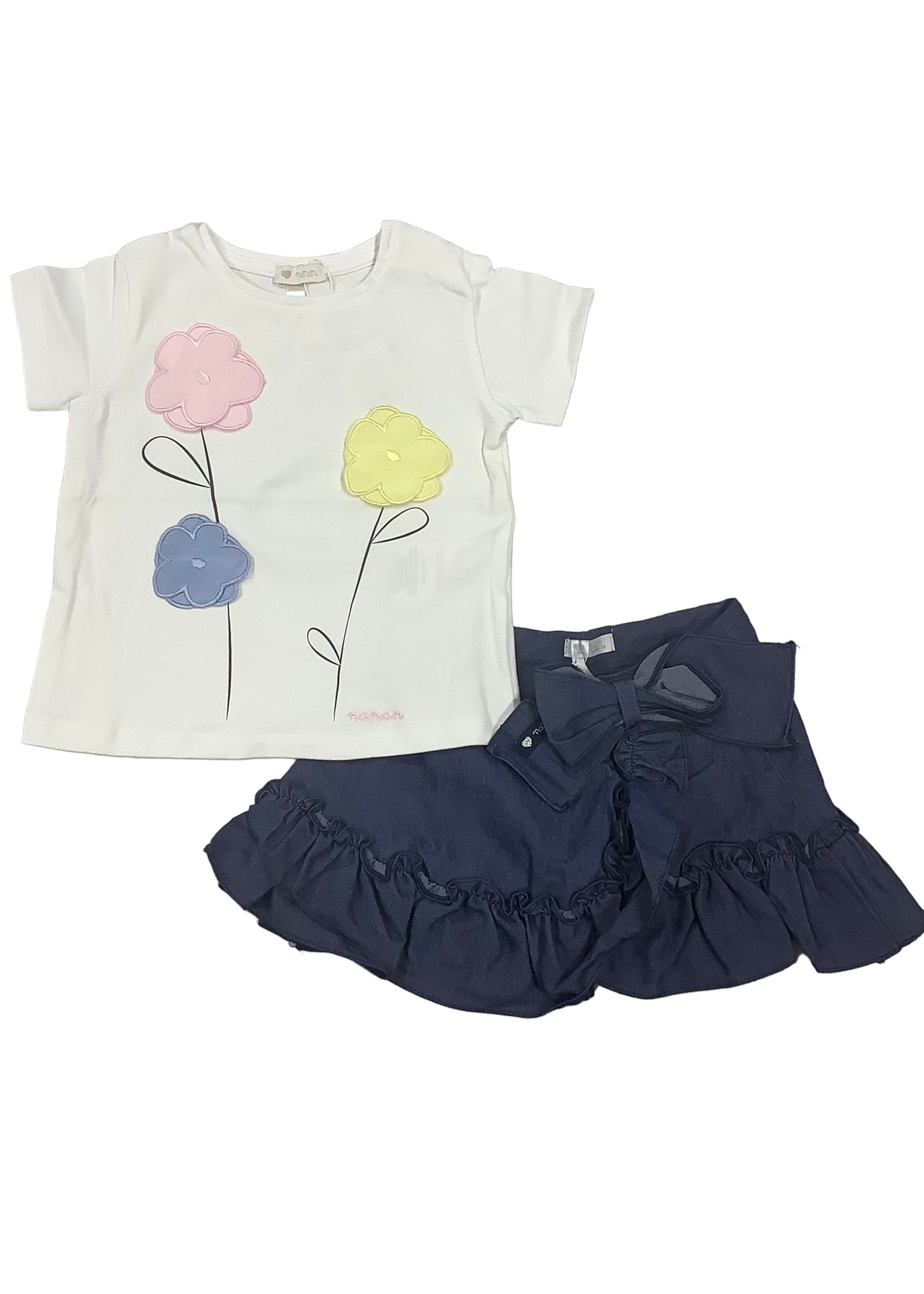 Lovely skirt set from Nanan. This set comes with a top, embroidered with flowers and a ruffled skirt with ribbon and has a side zip opening.