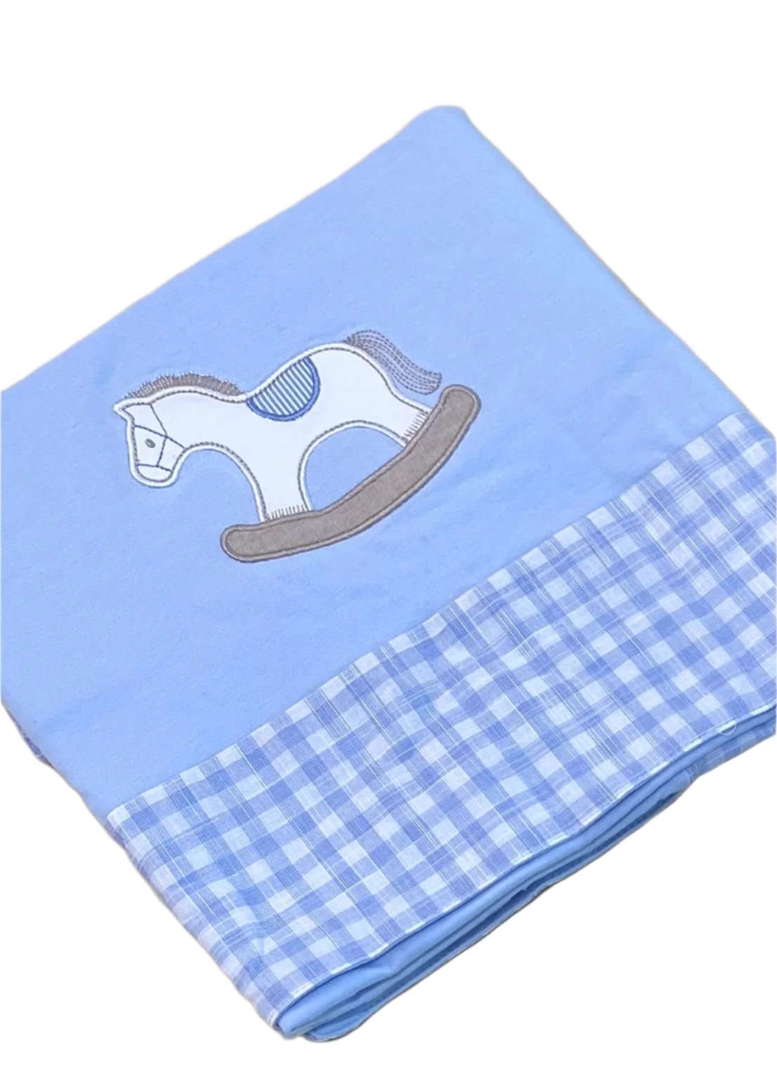 Baby boy blanket. Ideal to use as cover or wrap for baby. Designed with horse rocking chair embroidery with checkered details on the edge.