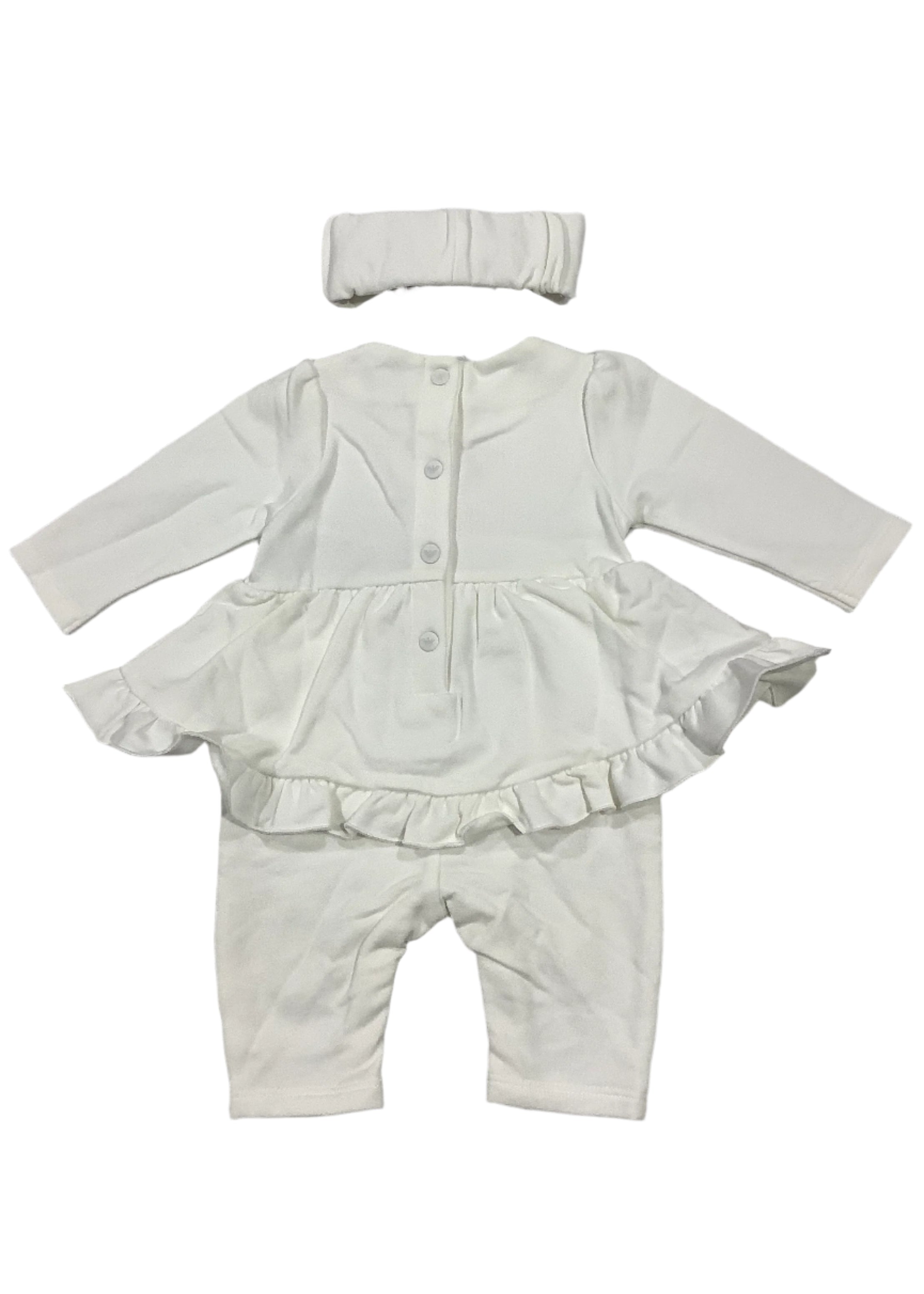 Made from soft cotton fabric. Has an attached bloomer and with embroidered ribbon design and 'EA' logo on front. With snap fastening button on back and between legs. Comes with headband with 'EA' logo.