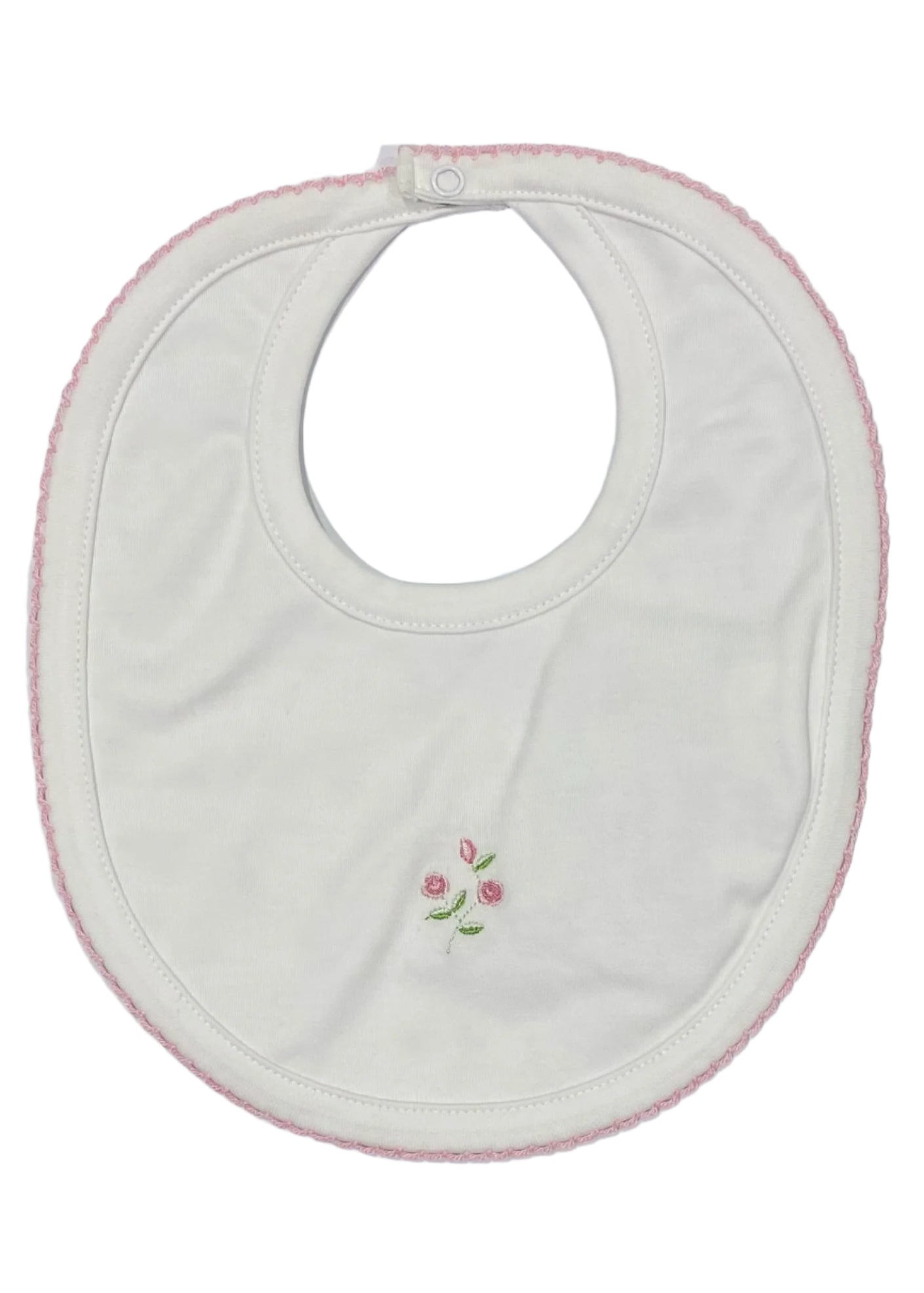 Double thickness bib, designed with All over print with embroidered rose flowers. White color in reverse with all over print rose flowers. Secured with popper.