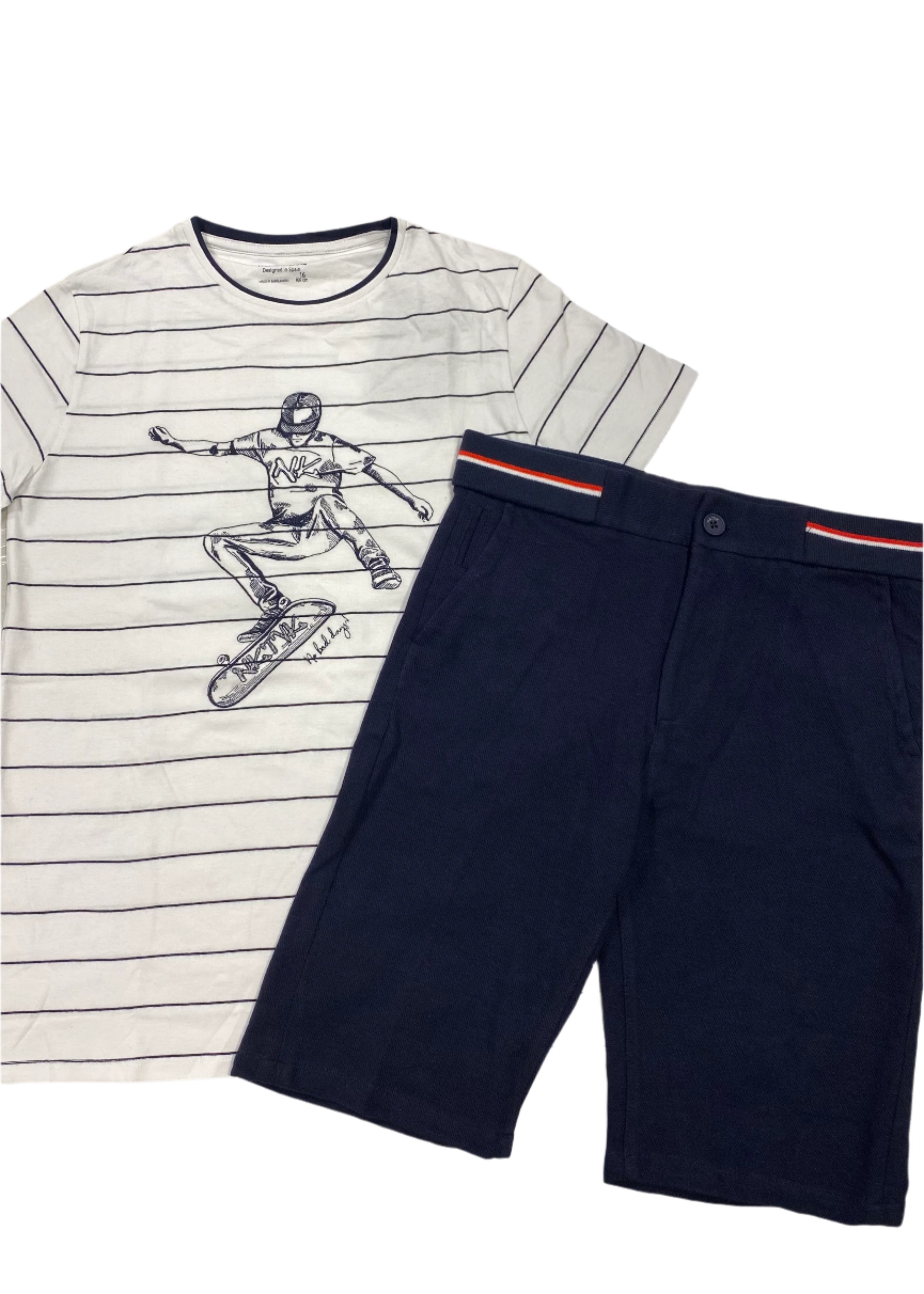 Stripe t-shirt is made of comfortable cotton with embroidered skateboarding design. Has a classic cut with short sleeves and double narrow ribbing at the neckline. Denim shorts has elasticated waistband, zipper and button for fastening. Also it has side and back pockets.