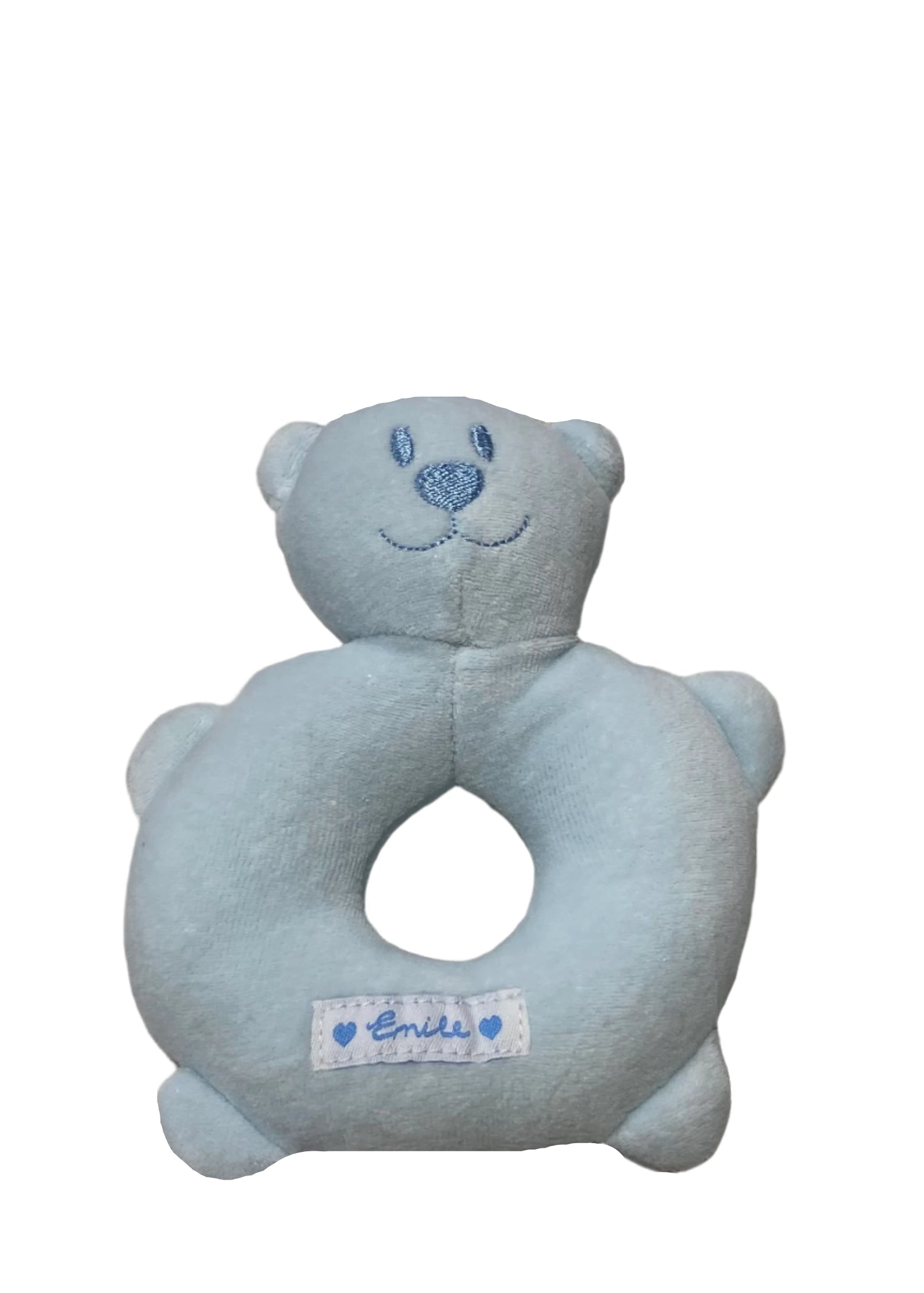This cool light blue rattle from Emile et Rose is made with a soft velvet with a teddy head and a ring shape for hands to grip and produce a sound when shaken. It has a light blue pretty little ribbon bow and a logo tag sewn.