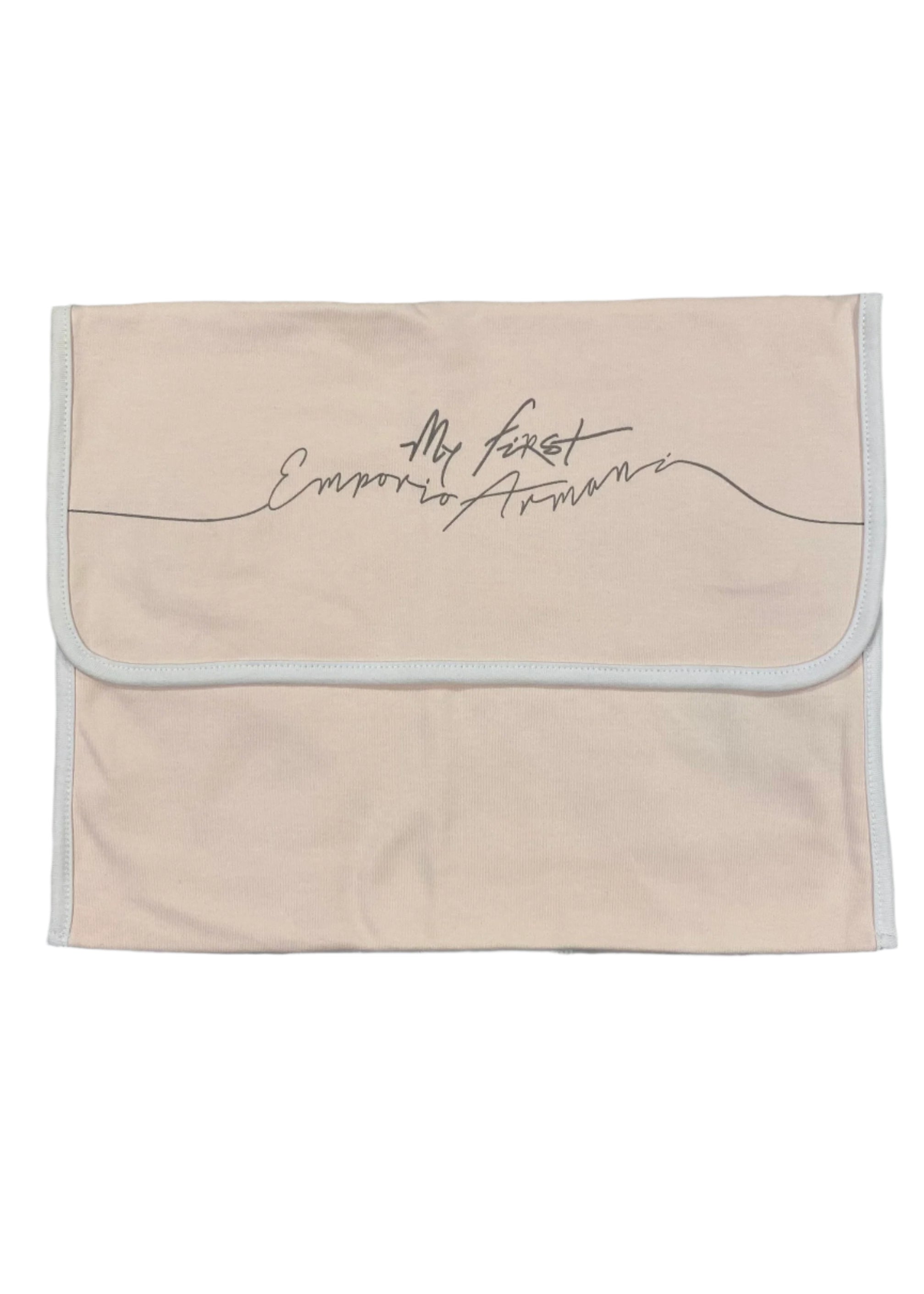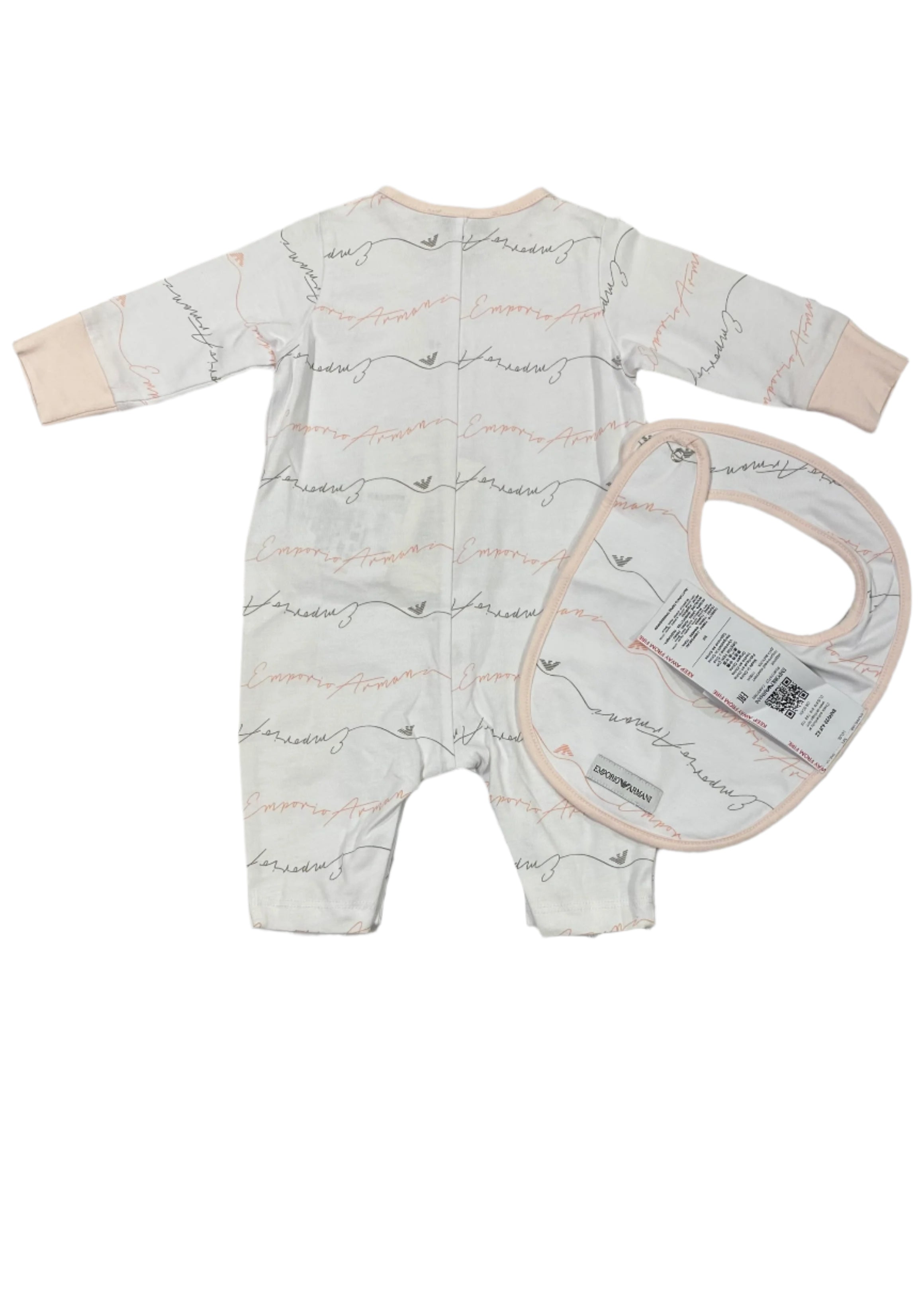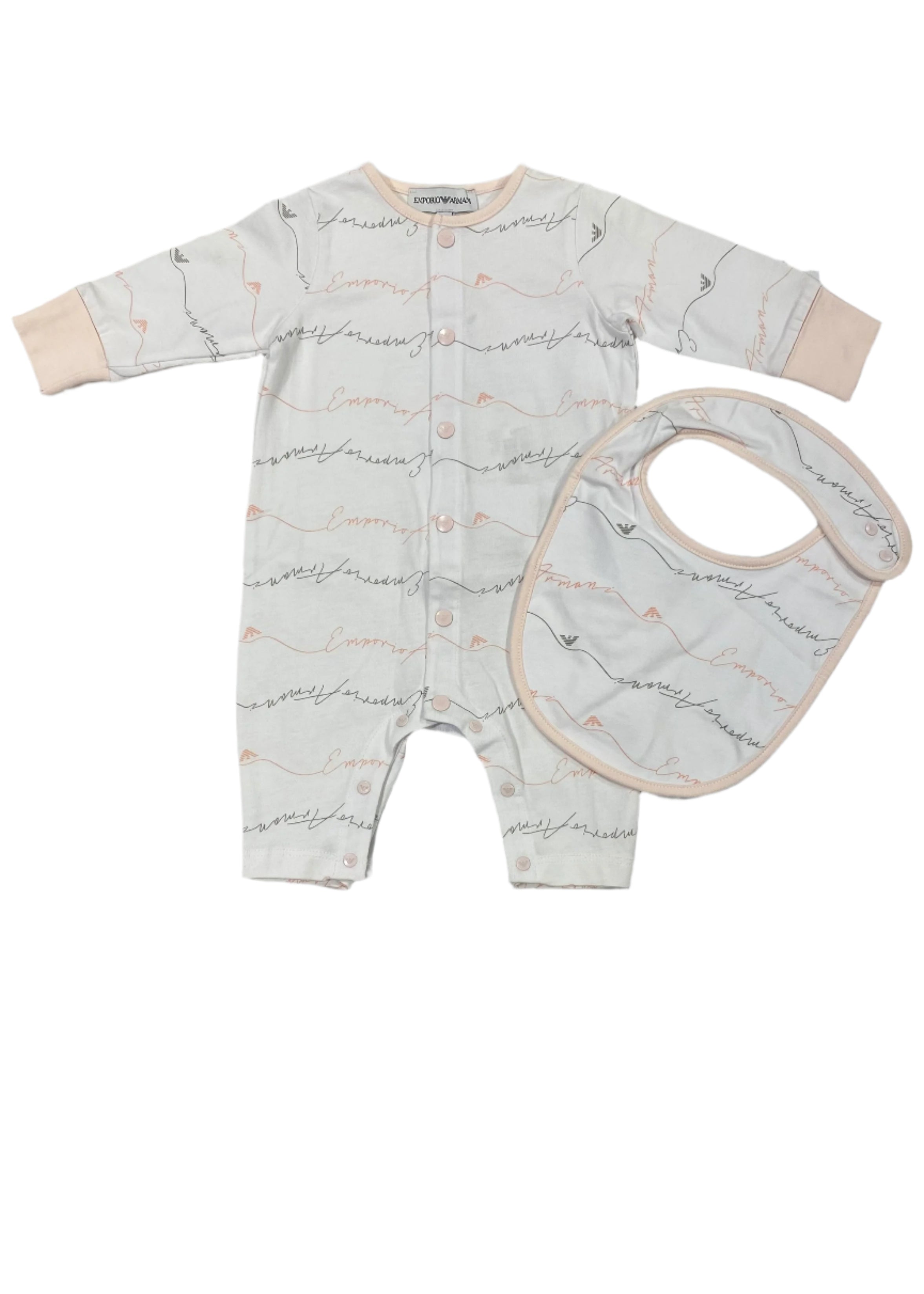 Baby girl romper and bib set. Both romper and bib are all over printed with 'Emporio Armani' design. Romper has front and in between legs snap button fastening.