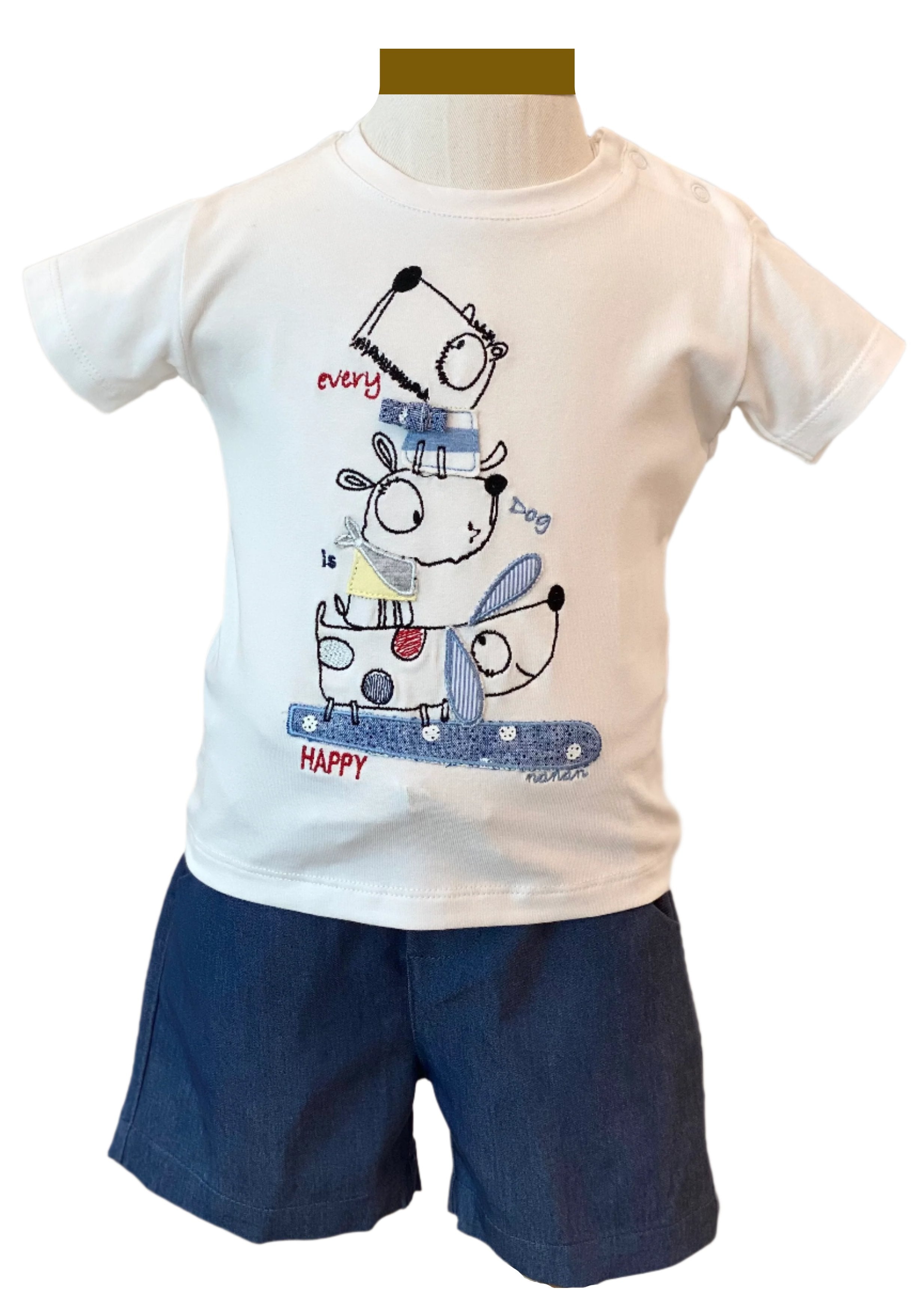 T-shirt and short set for boy. The top has cartoon embroidery design on the chest. Short has pockets, elasticated waistband with pull string.