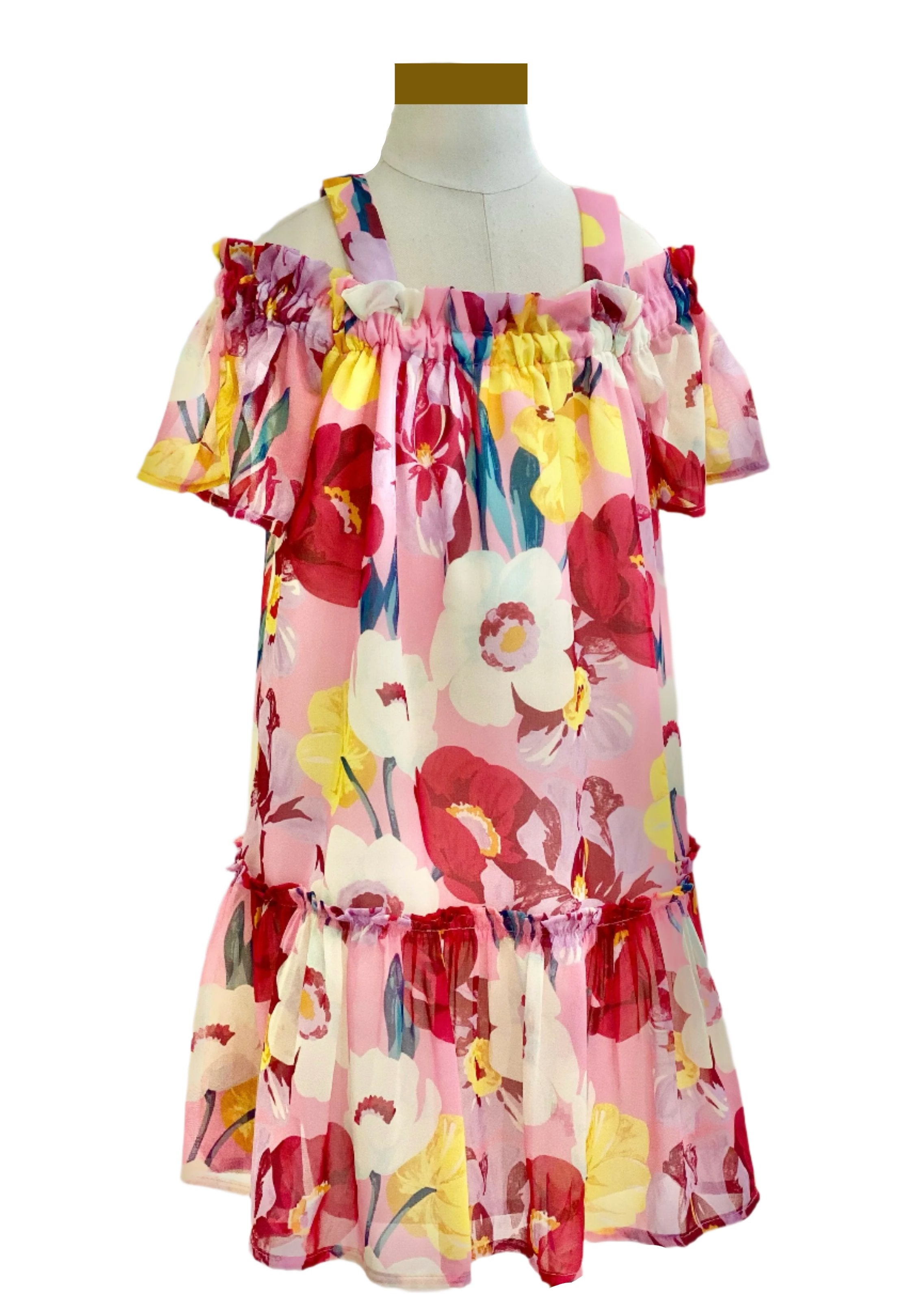 Off shoulder neck dress, made in soft and lightweight chiffon. Pull-over style is patterned in a beautiful fuchsia pink and yellow allover floral print.