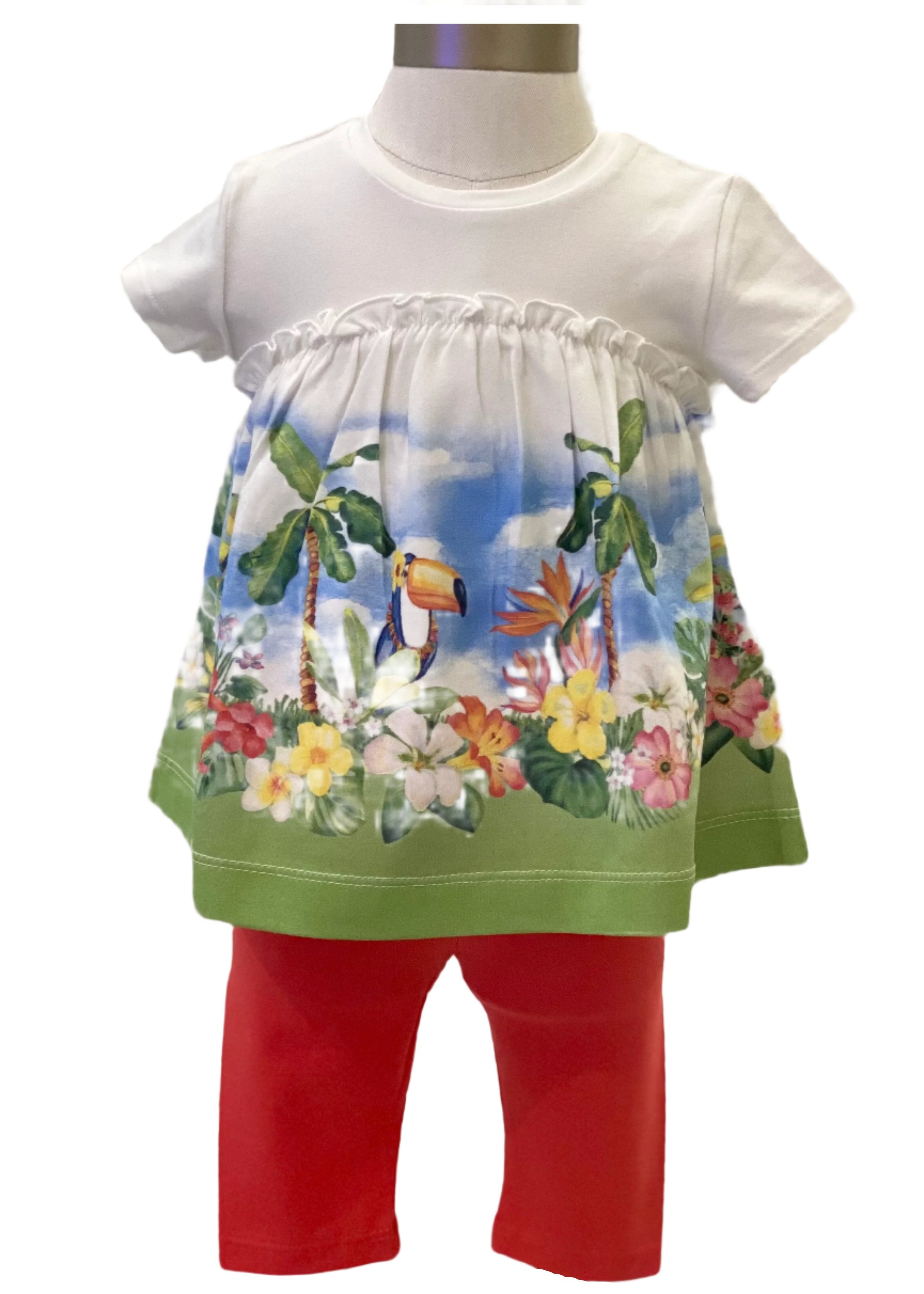 Comfortable, casual baby girl outfit. This set comes with a flare cut top designed with floral and toucan print.