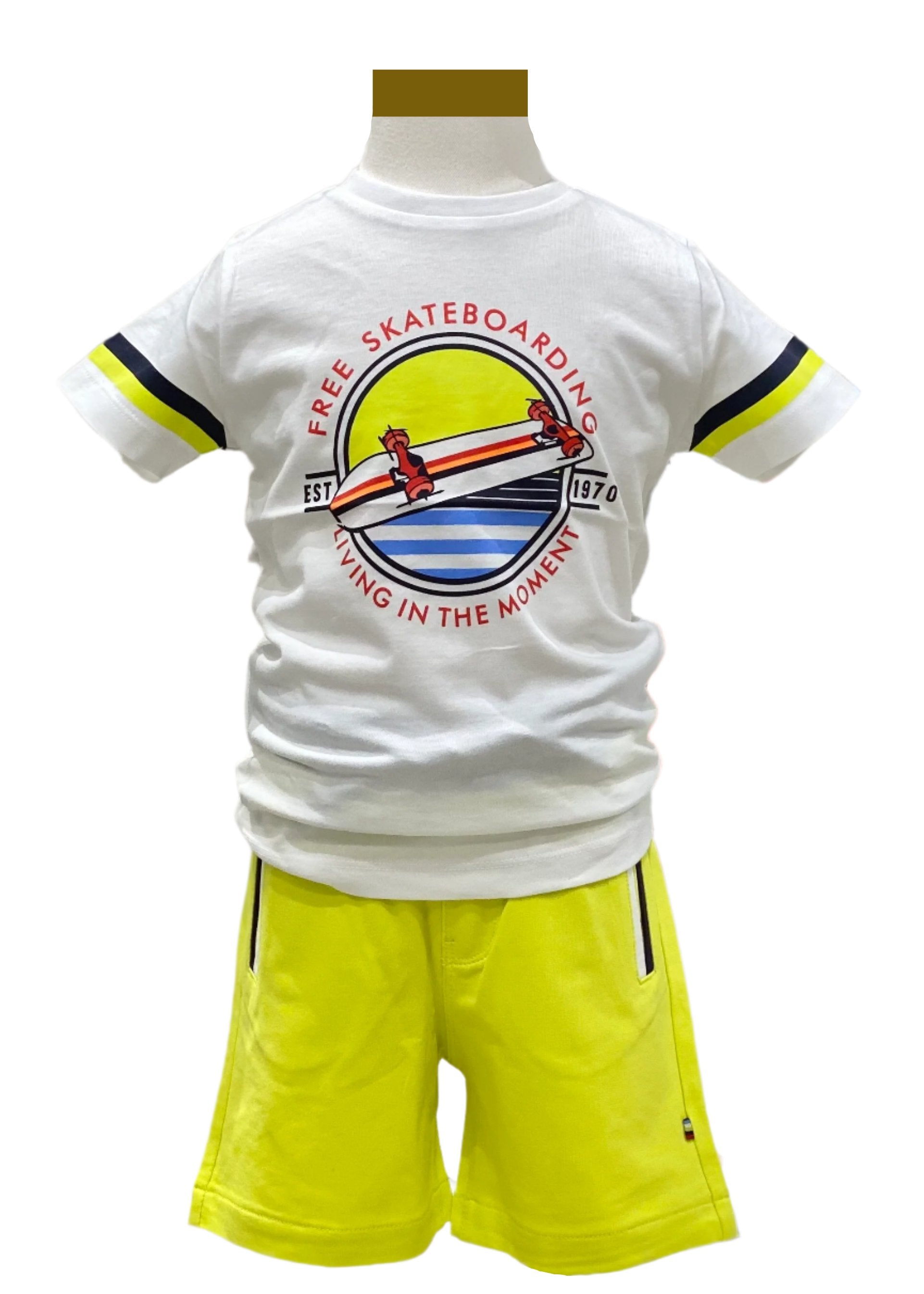 Cotton soft casual short set. The top is a round collar t-shirt that has 'Free Skateboarding' on the chest and stripe detail on the sleeves. This set also comes with matching soft short with pocket, elasticated waistband.