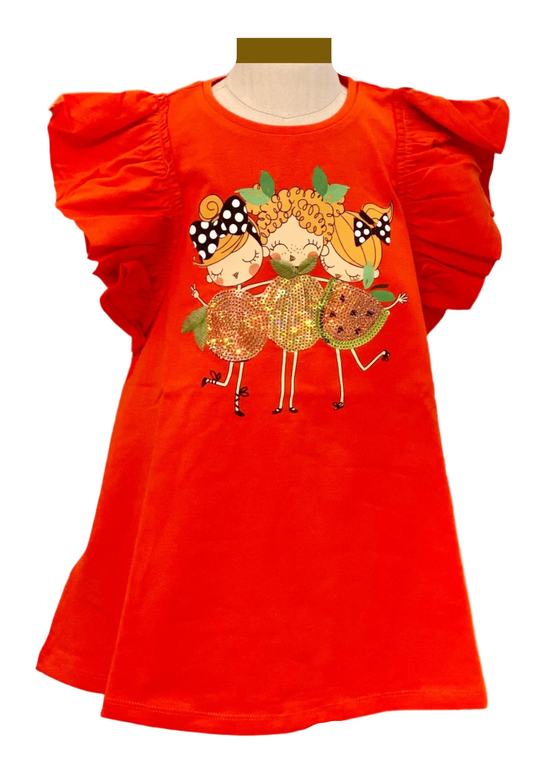 Lovely girl's cotton dress designed with girls print with fruits outfit embroidery in sequins. Ruffle on sleeves.