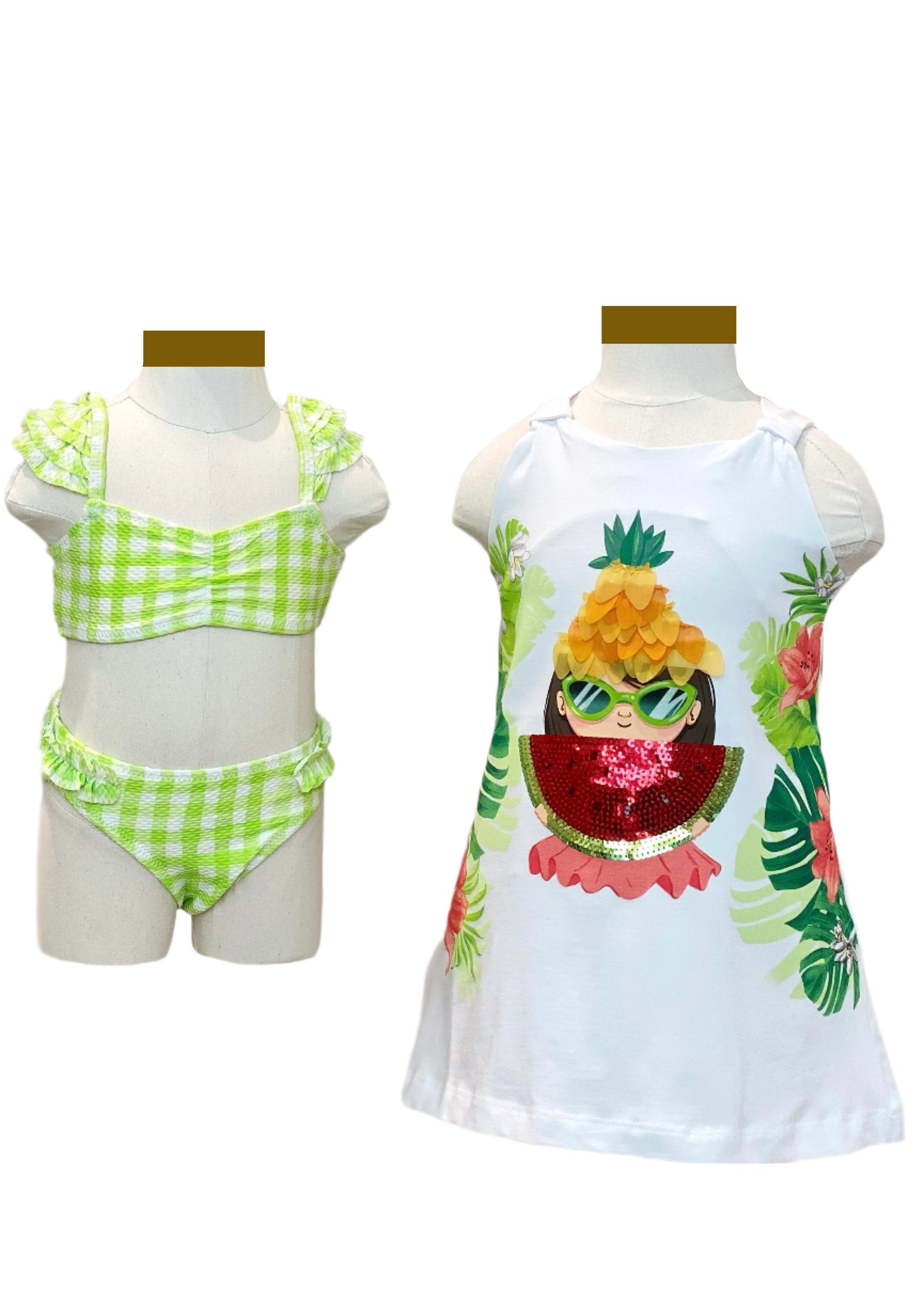 Adorable girl's swimwear. It comes with a two-piece swimsuit in checkered pattern print with bow appliques and a matching cover up dress in fruits theme embellished with sequins.