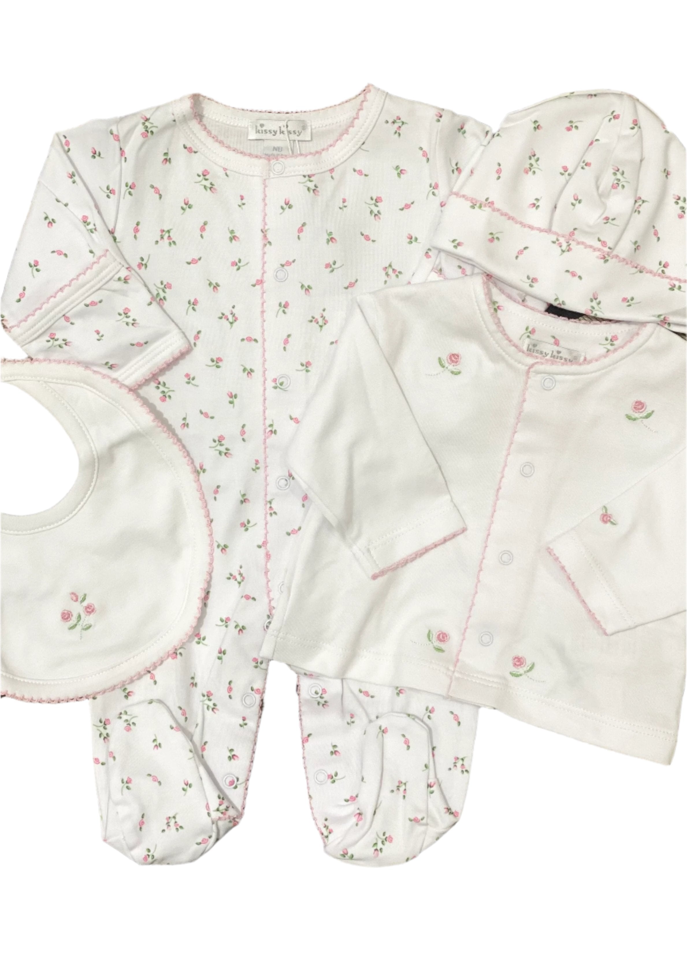 A perfect gift set for newborn. This set comes with an overall, hat, bib and a jacket. All are designed with garden roses print or embroidery. The overall and jacket are button fastening on the front.