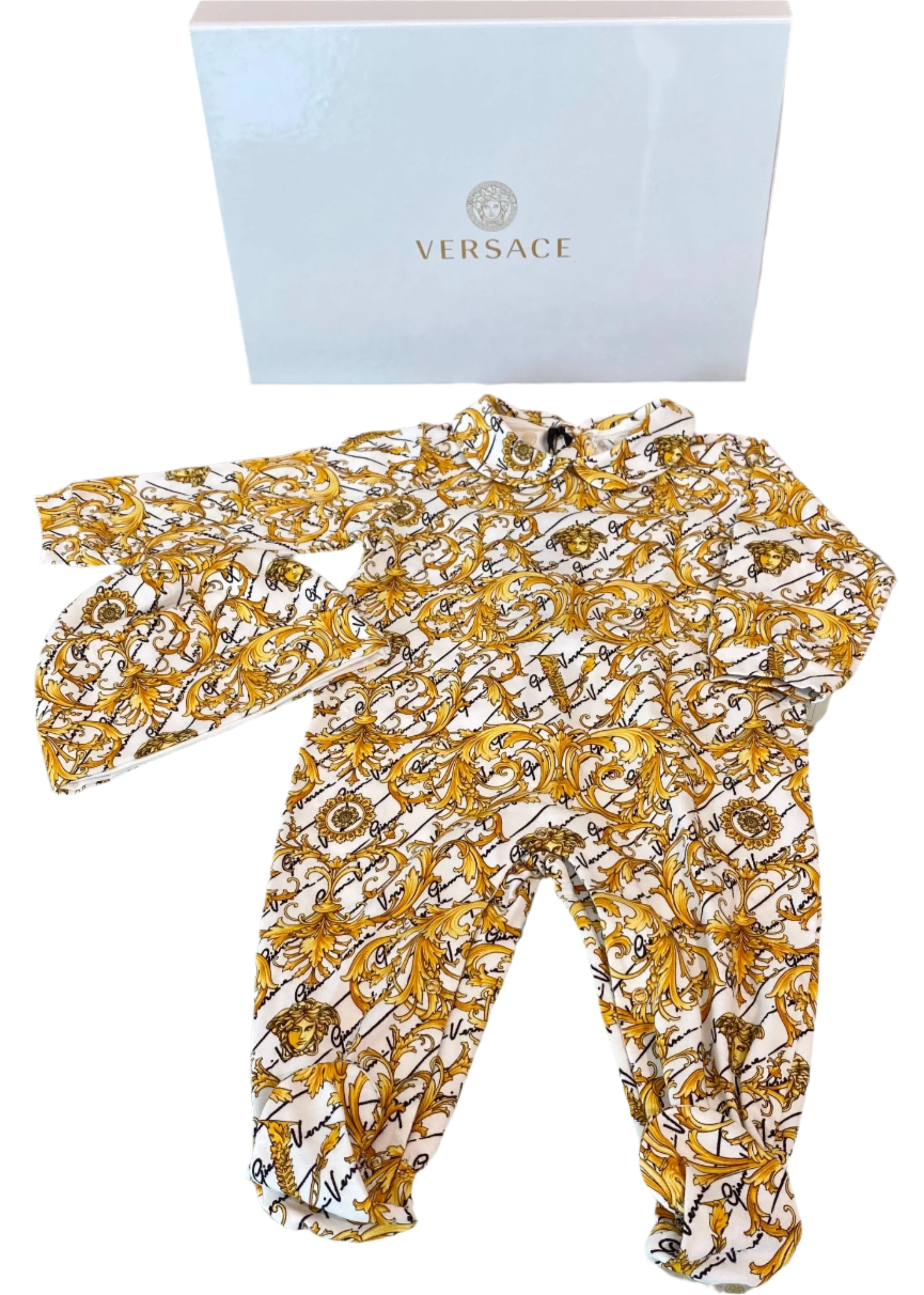 A perfect, elegant baby gift set. This set comes with an overall and a hat. Both are all over printed with classic frenzy barocco pattern, 'Gianni Versace' writing and medusa logo. Overall has snap button closure at the back and in between legs.