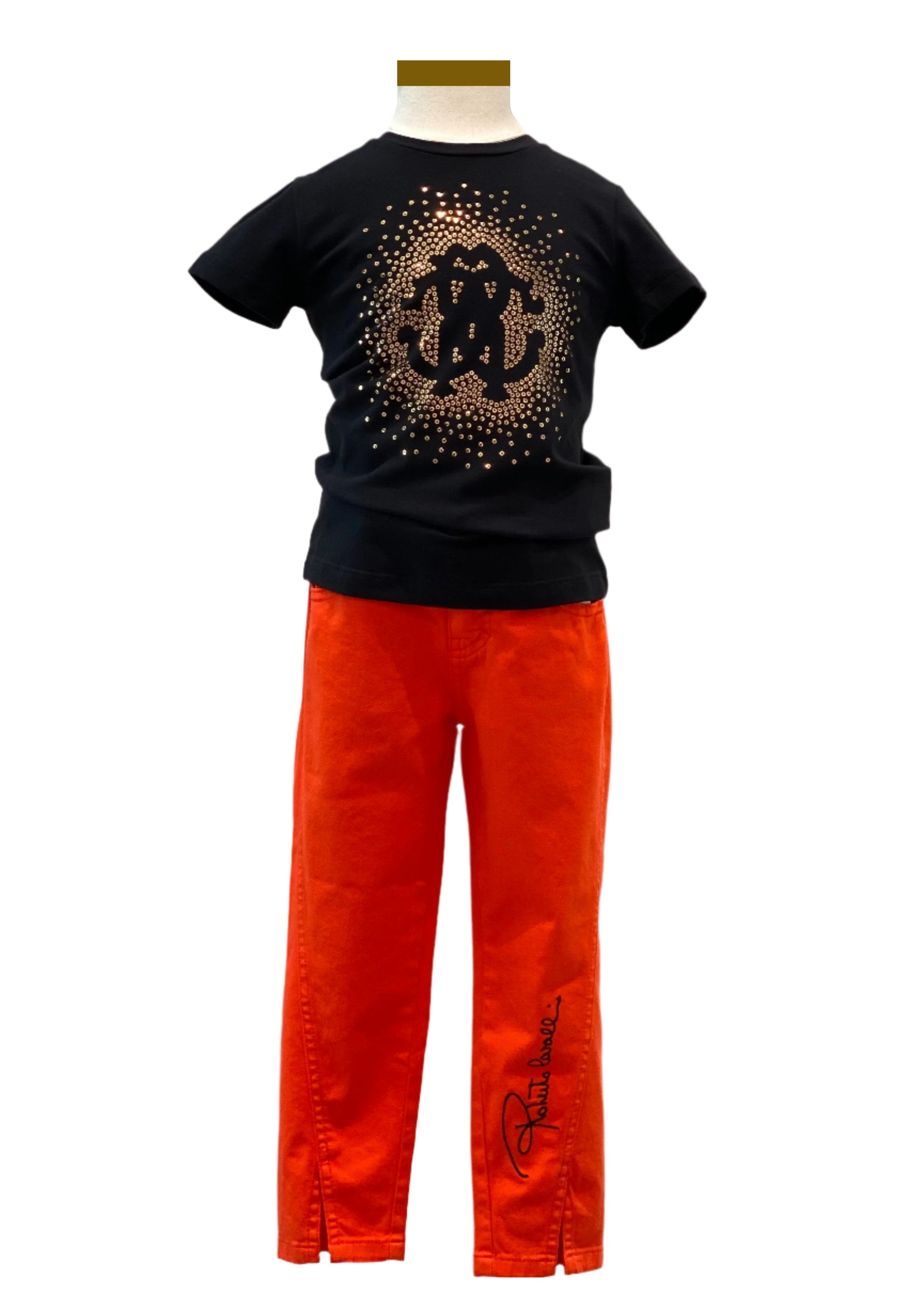 Chic, casual girl's outfit. This comes with a short sleeve t-shirt, designed with golden sequins forming 'RC' logo. This top is matched with stylish red-orange pants with slit on both legs, finished with brand name embroidery.