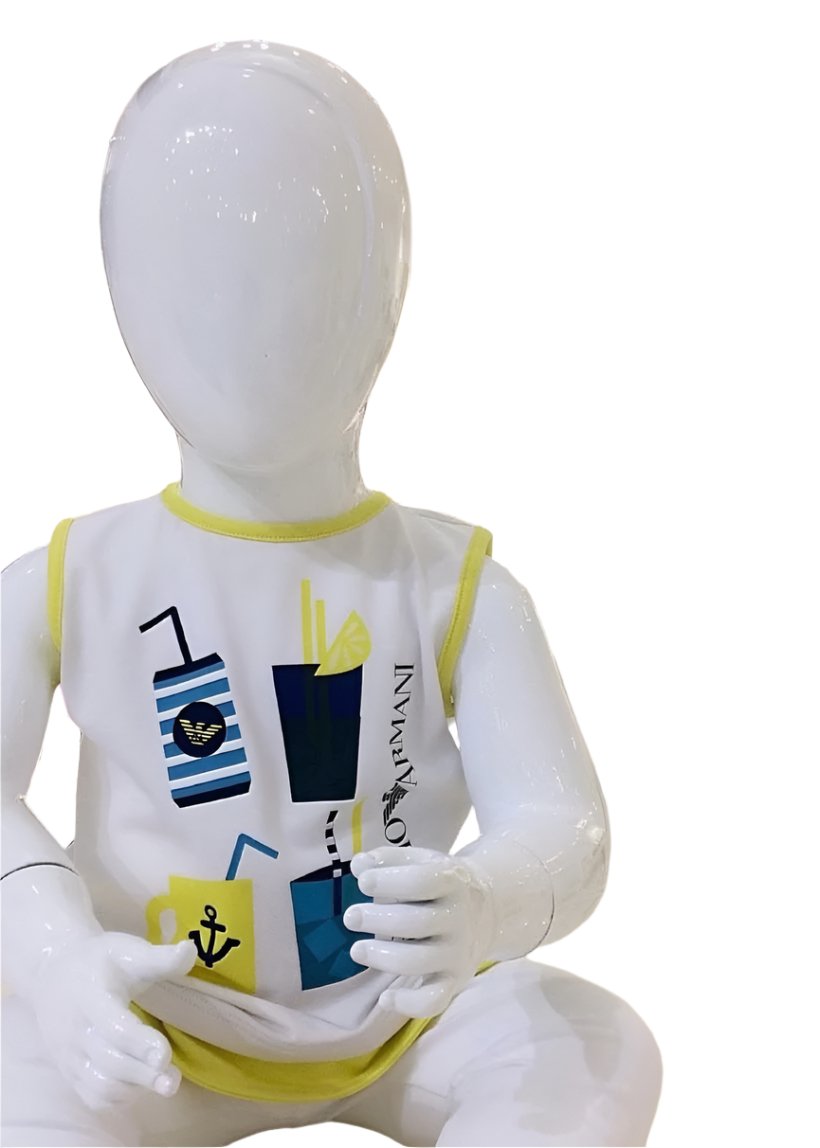 This cottony top and short set is comfortable to wear. A sleeveless top with glass and straw design on the chest. Has yellow trim and hem on the edge. With snap button and 'Emporio Armani' logo on back.