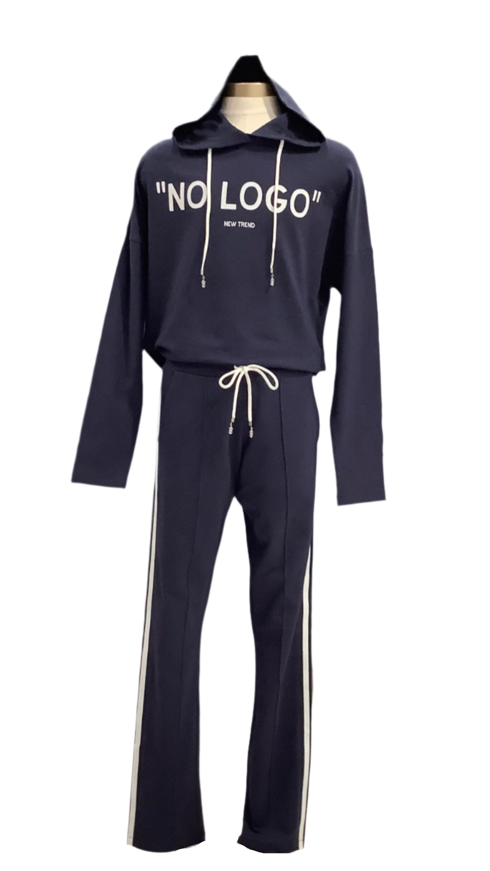 This tracksuit in navy color with glittery 'No Logo' design, has long sleeve and hood with pull string. Trouser has contrasting color edges with elasticated waistband with pull string.