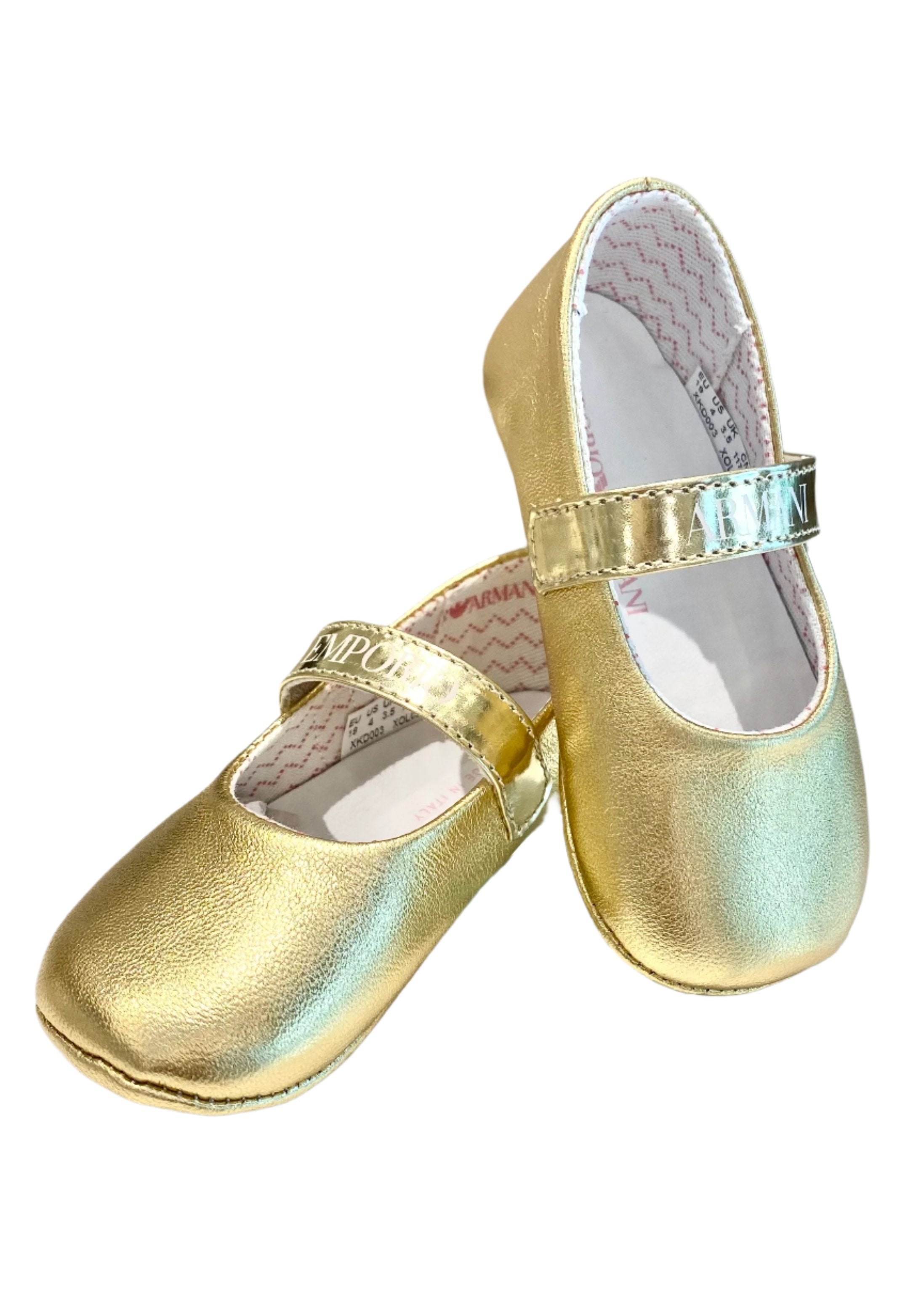 It is made of leather from Italy. Has metallic gold color and strap closure with 'Emporio Armani' writing.