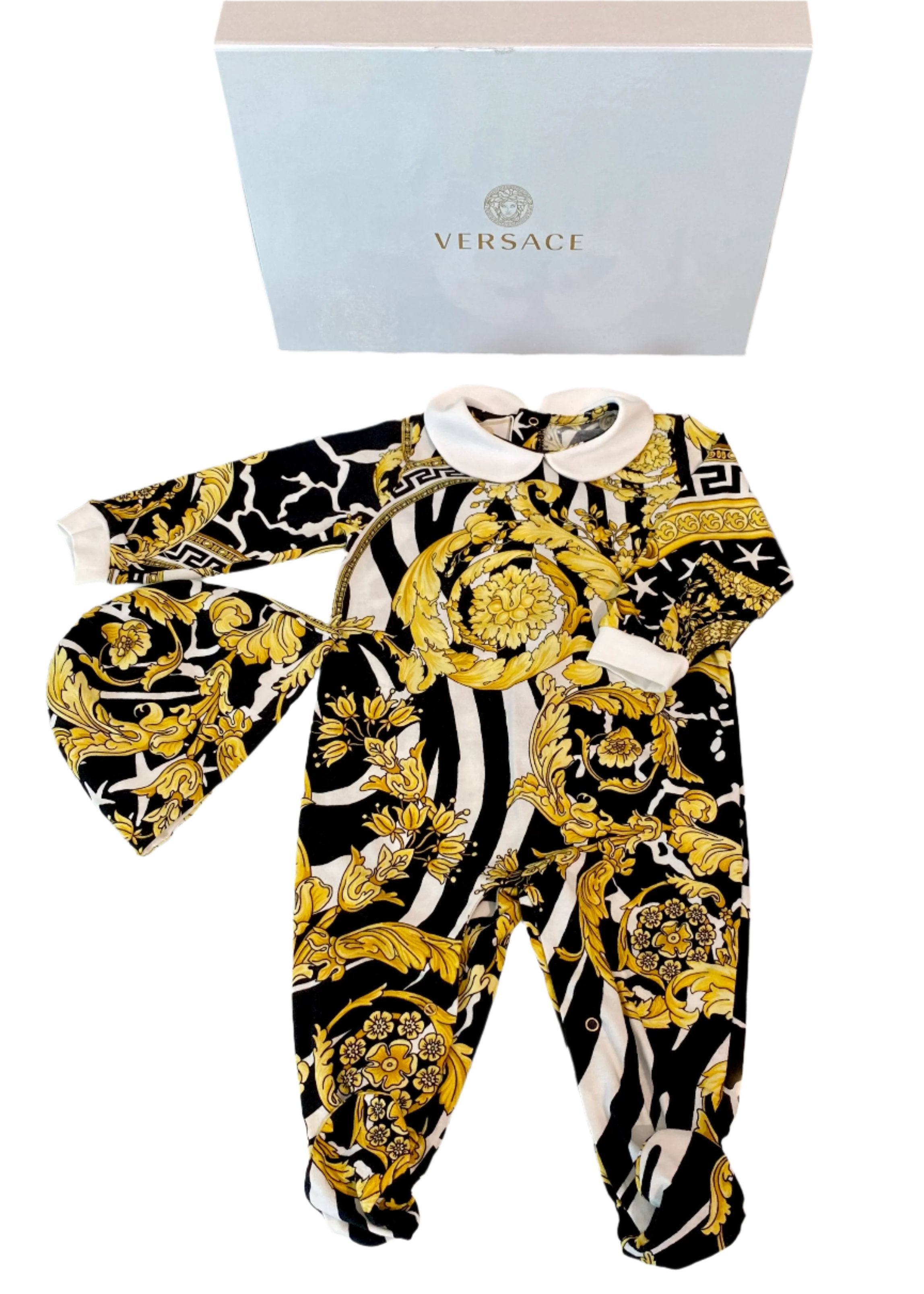 Beautiful baby gift set. Choir-boy collared overall with hat. Both are all over printed with baroque pattern in black and gold. Overall has snap button closure at the back and in between legs.