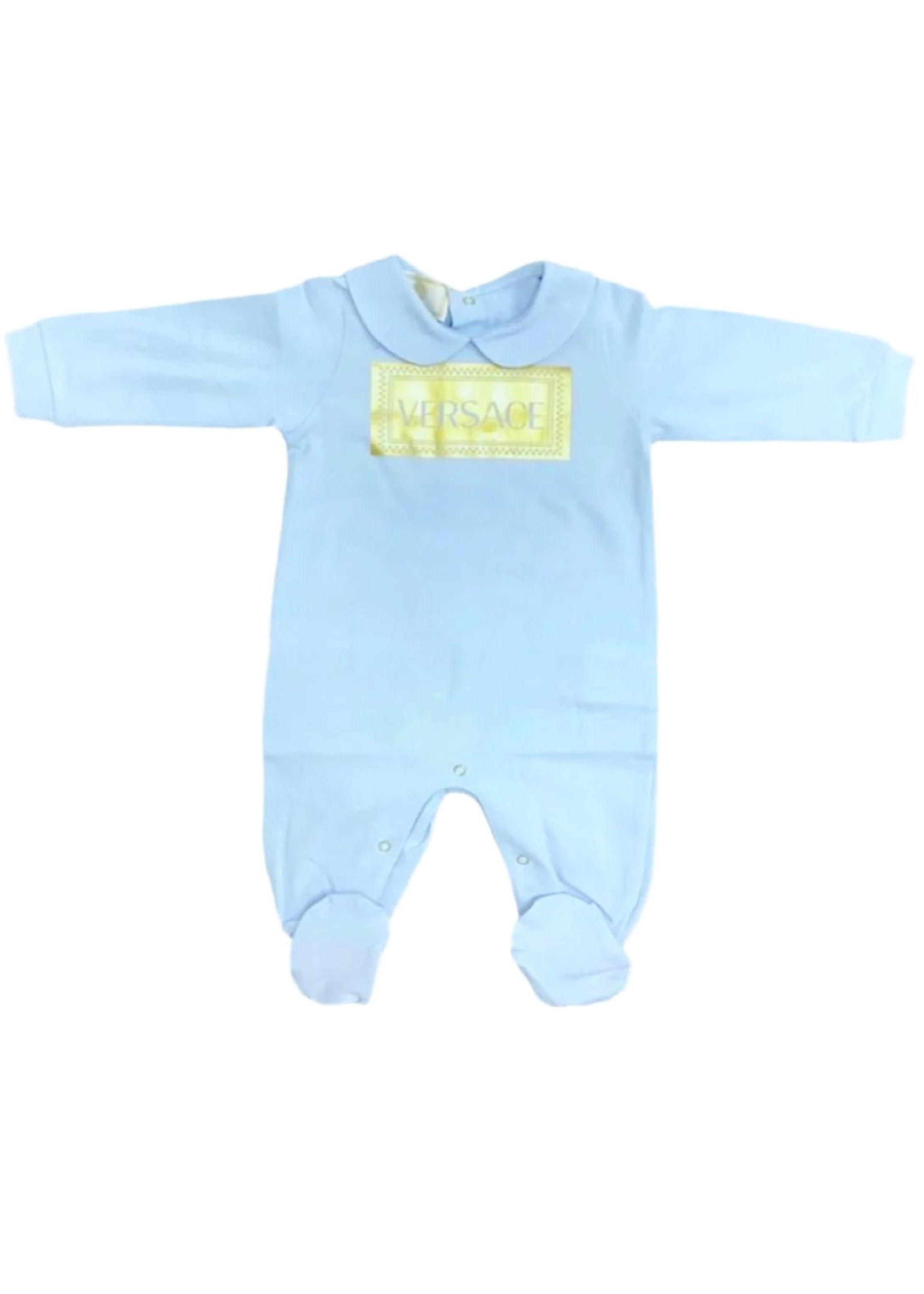 Classic Versace baby romper. Simply designed with 'VERSACE' writing in gold label print. Choir-boy collar, snap button fastening at the back and in between legs.