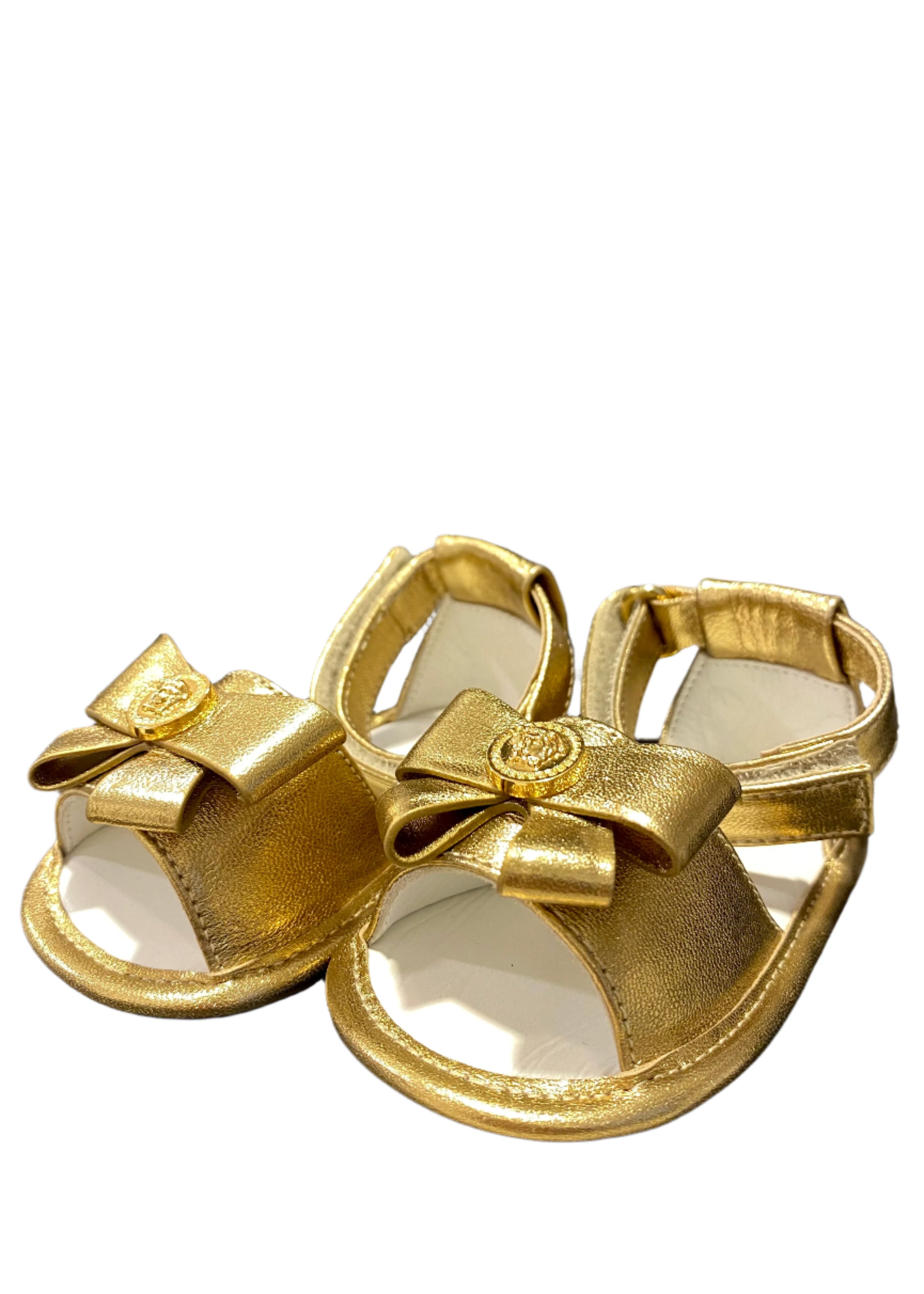 Lovely, elegant baby girl pre-walker sandals. Bow applique design with golden medusa emblem. Velcro strap closure. Finished with medusa design on the sole.