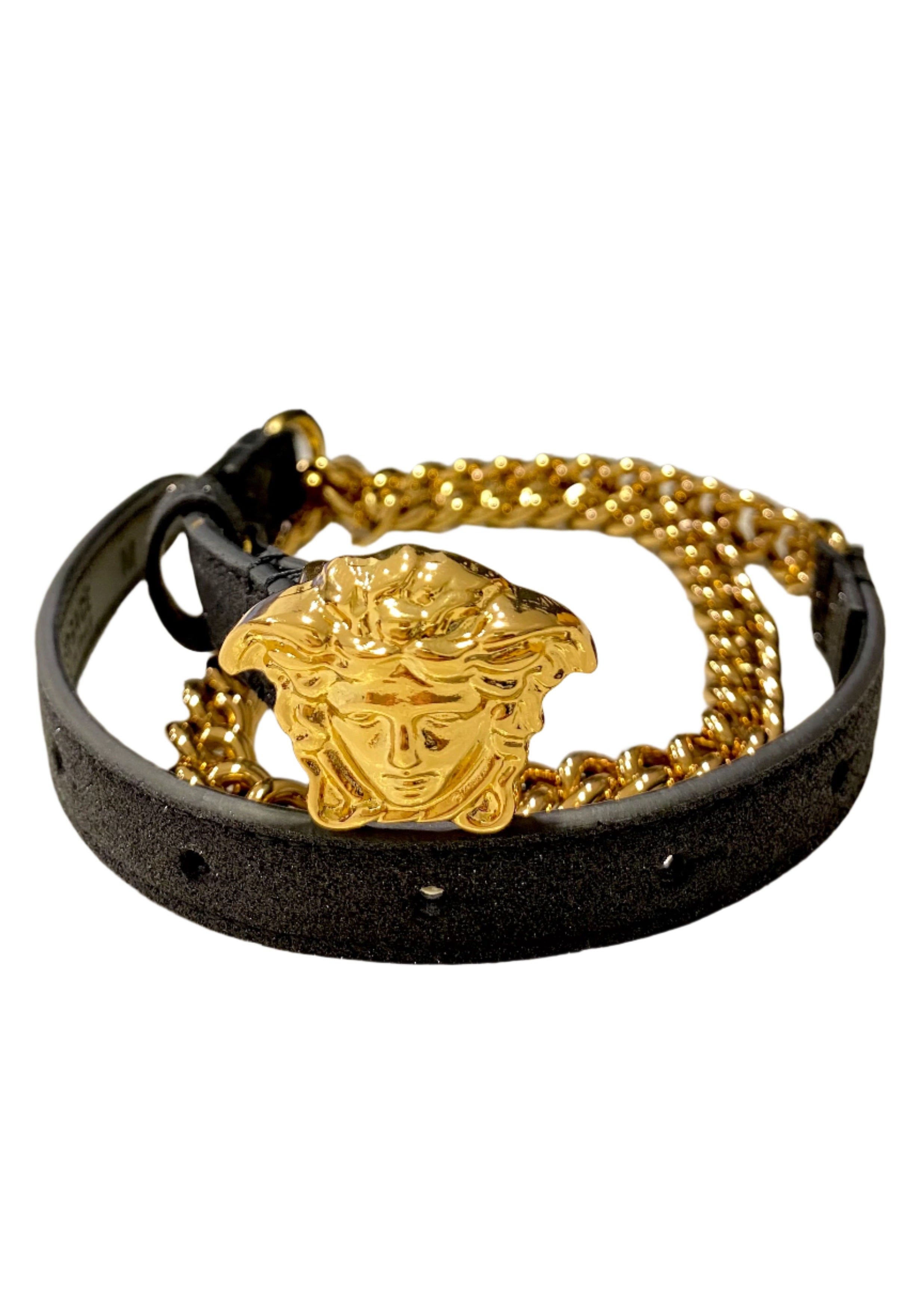 Sassy, classy accessory. Leather chain belt, glittery on leather part. Finished with golden medusa logo as a buckle.