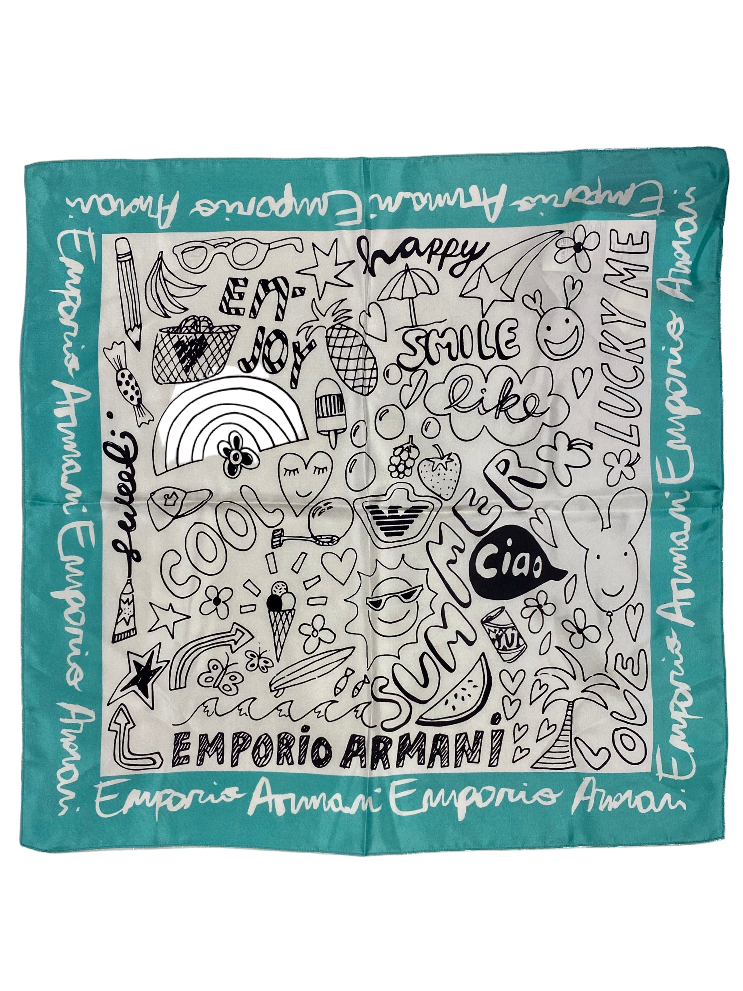 A thin, soft material of silk, has 'Emporio Armani' writing having a printed pattern.