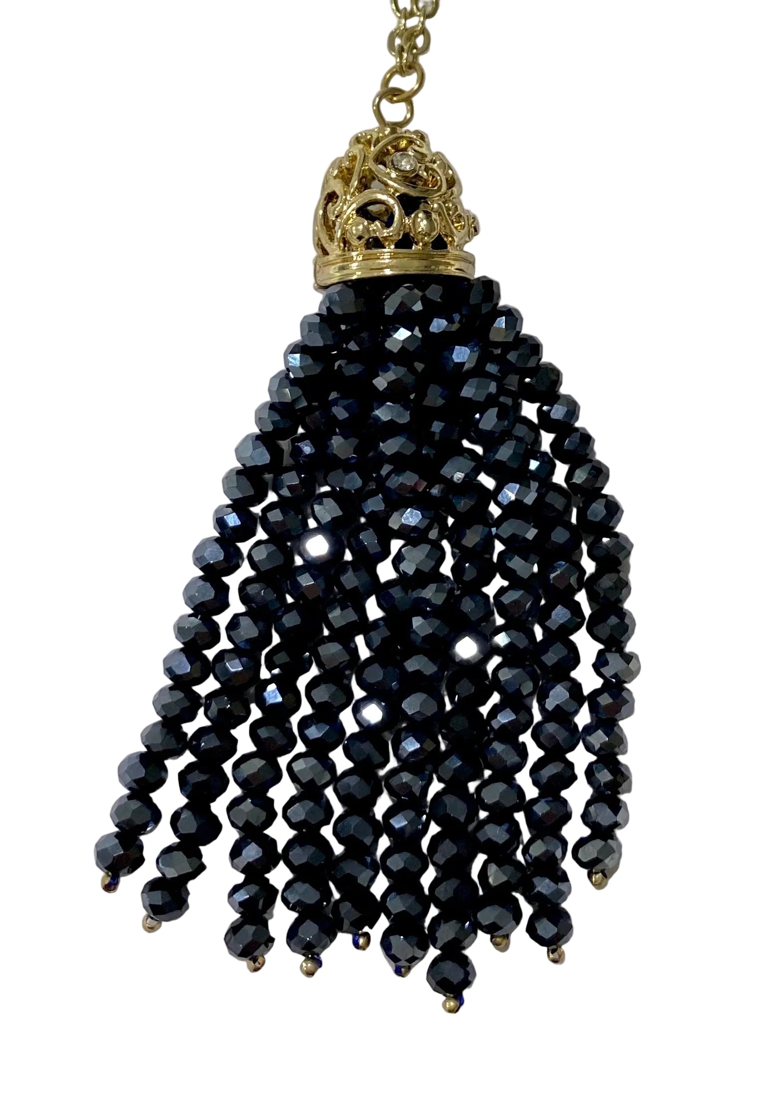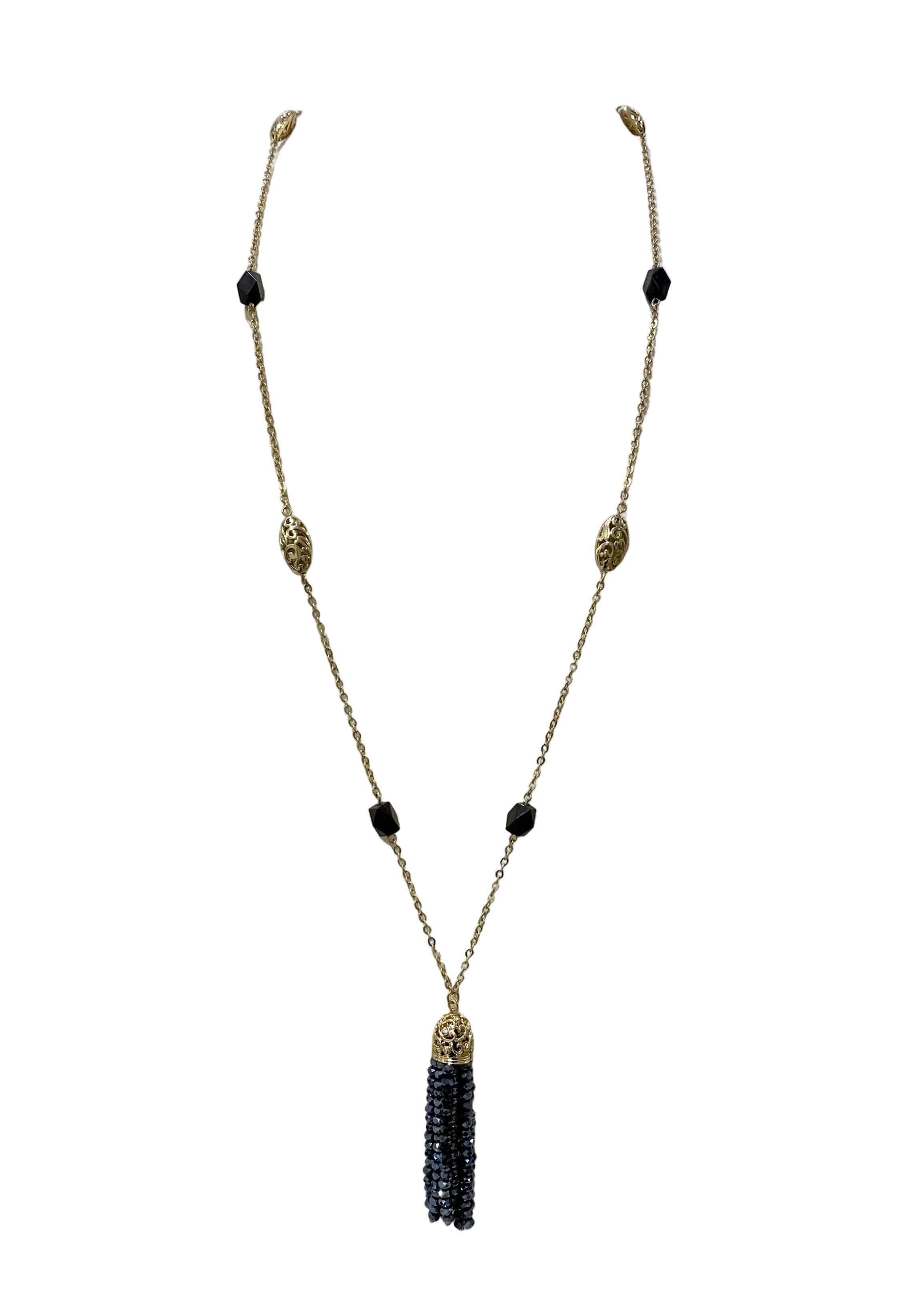 Long tassel necklace with black beads and decorative links in gold accent. Classy vibes.
