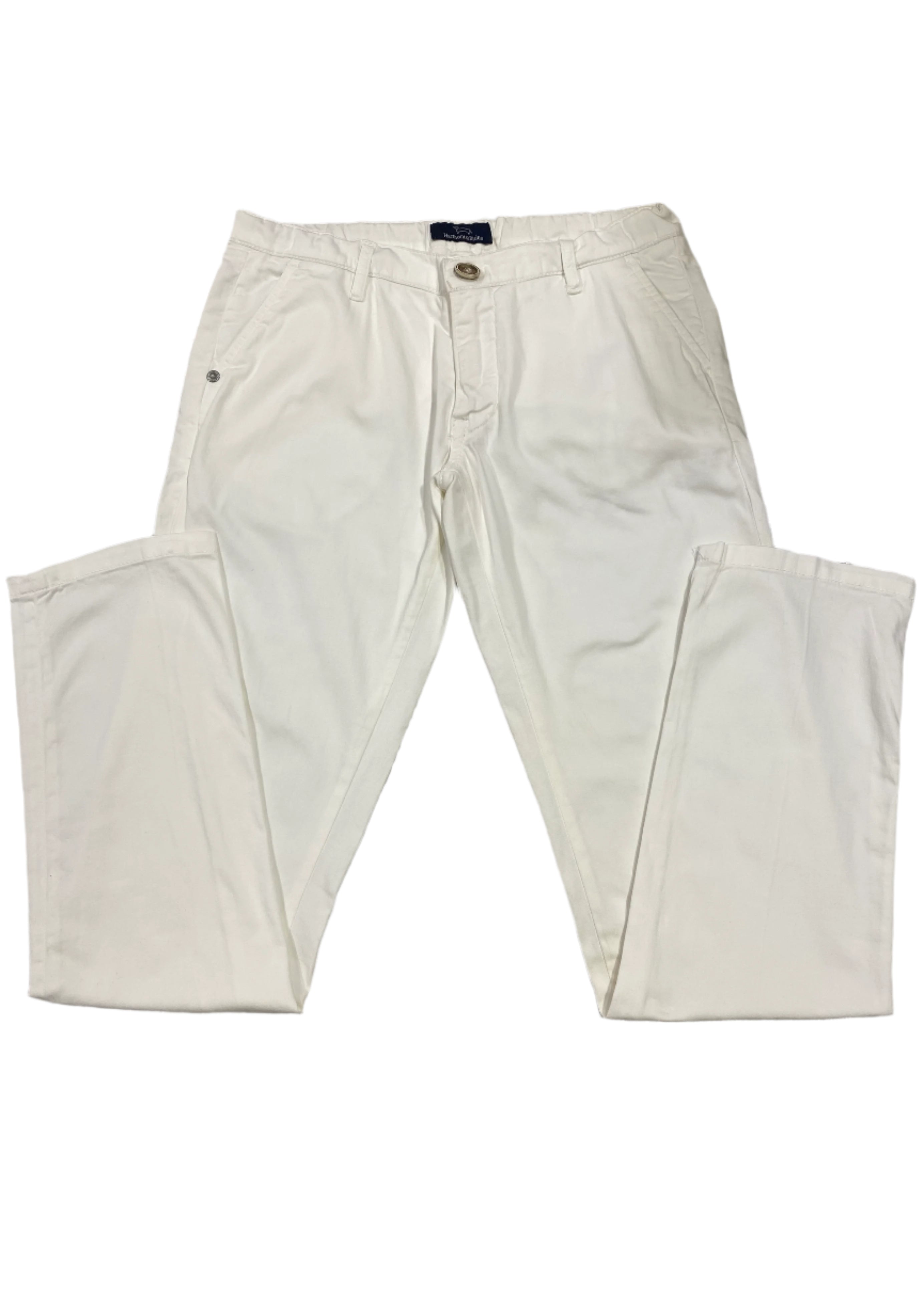Made of cool and lightweight fabric. With two handy side pockets and has two button on back pockets, one of which is finished with the iconic Blaine dachshund embroidered in contrasting thread. Has zipper and button for fastening.