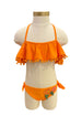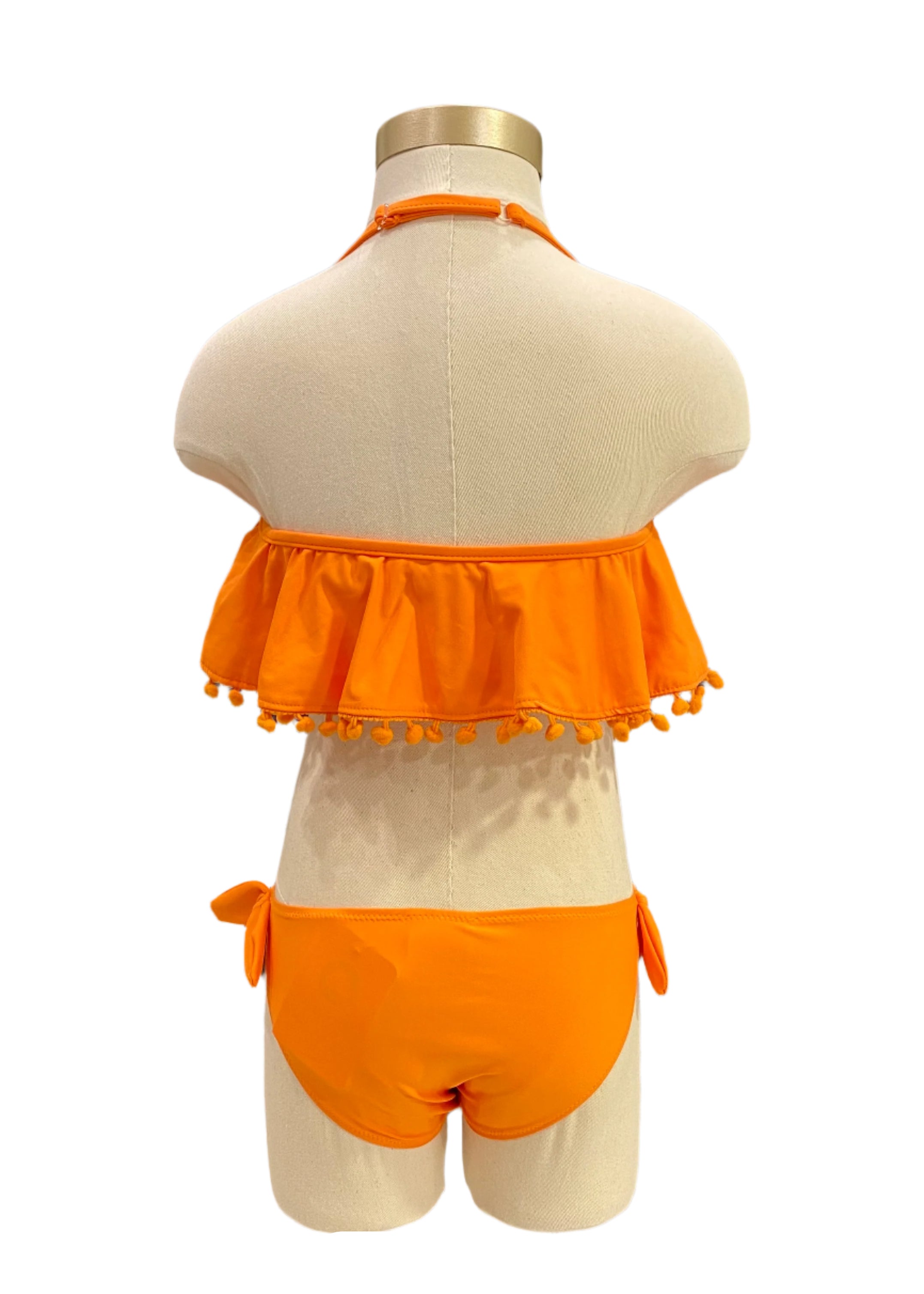 Girls lovely bikini. The top is lined with pom fringe trim. Both pieces are silky smooth and stretchy with embroidered flowers and has ribbon on both sides.