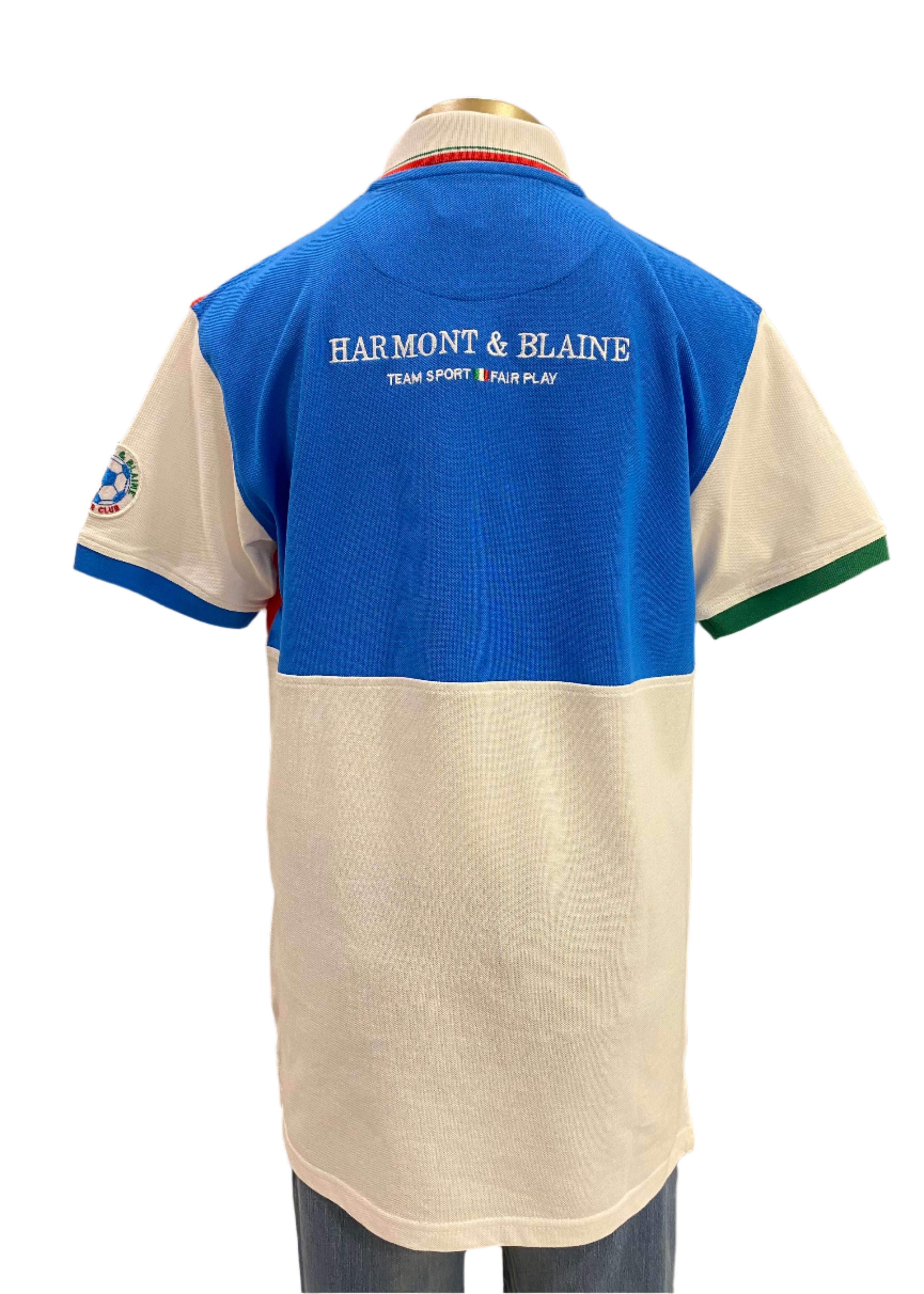 Set of pique polo shirt and denim jeans. Polo shirt has a color block design, with brand name and logo embroidery details. Its hem sleeves are knitted and colored. It also has a striped detail on the collar. The matching pants is soft with standard pockets.