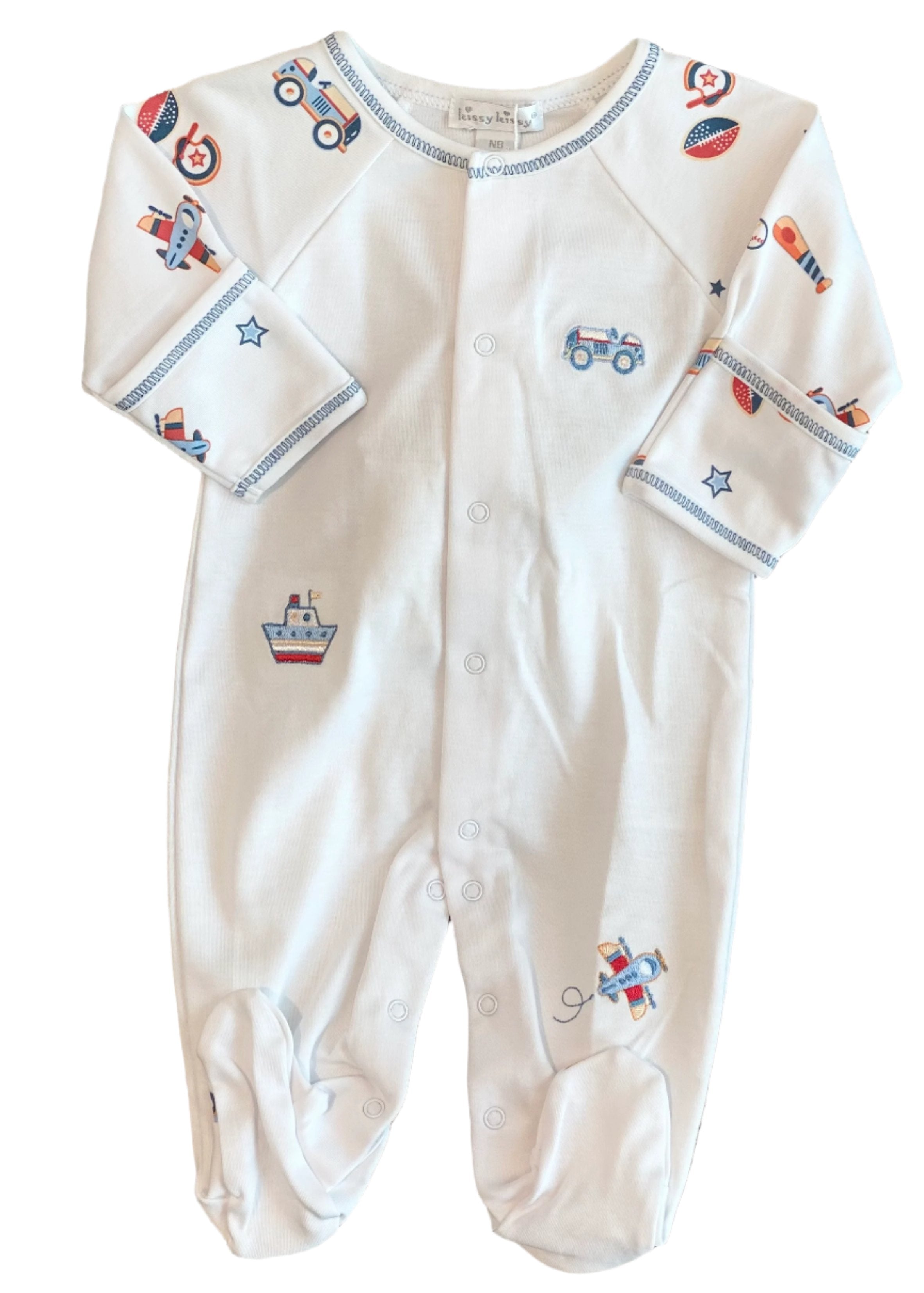 Babygro for boy. Printed with things for boys. Snap button fastening on the front and in between legs.