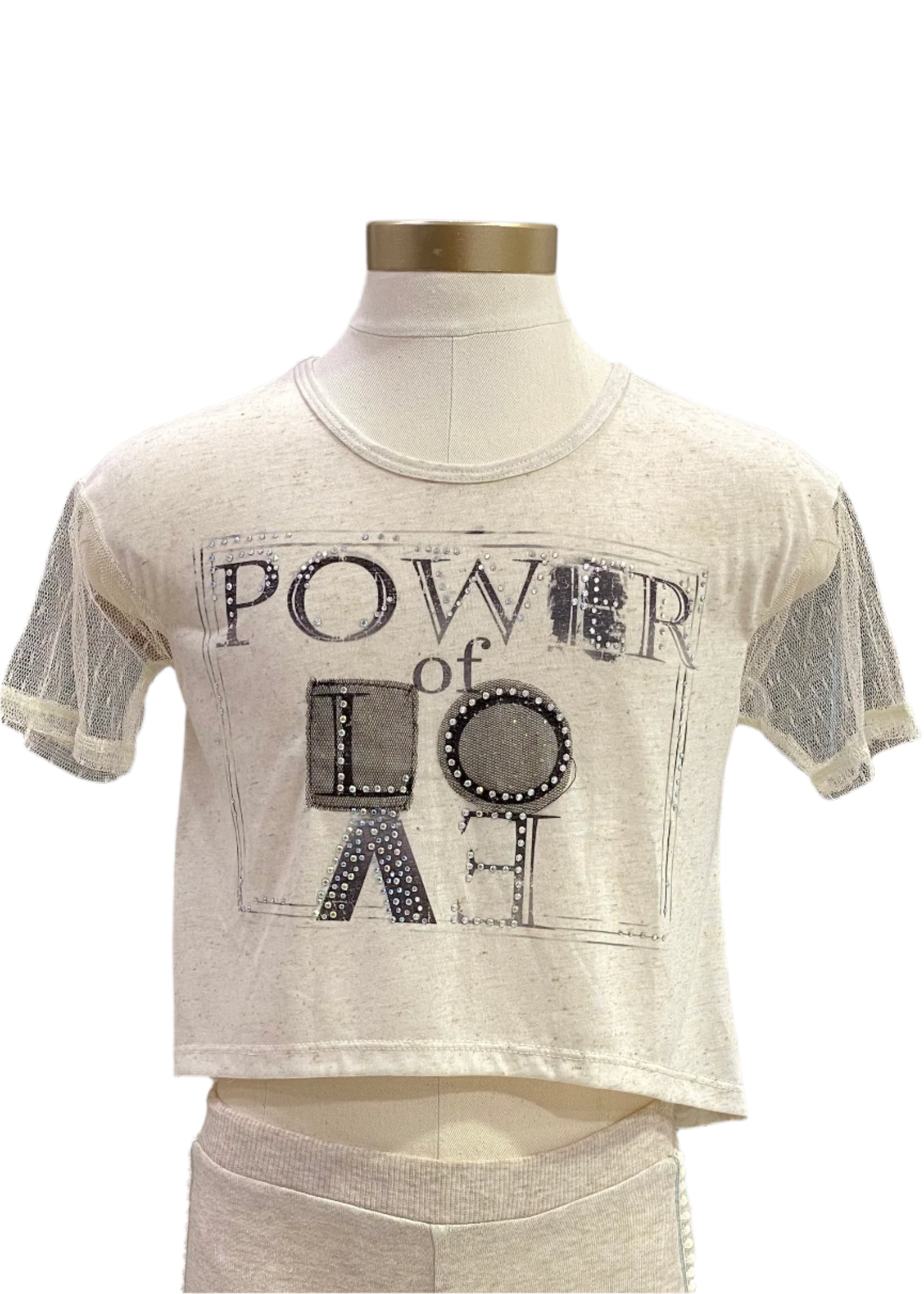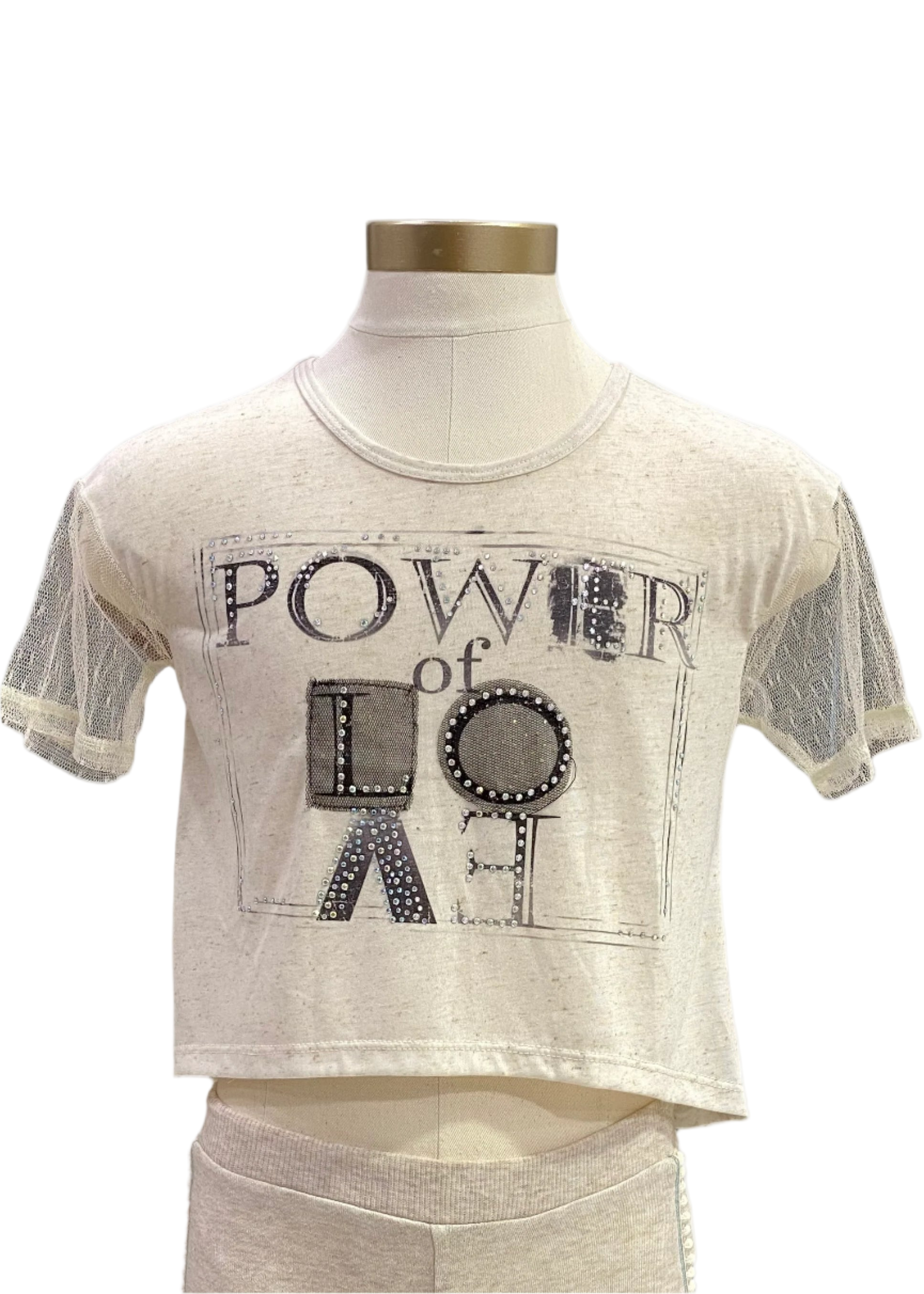A soft top that is longer in the back with a cropped front that will reveal your belly. Has sequins design on 'Power of Love' writing on the chest.
