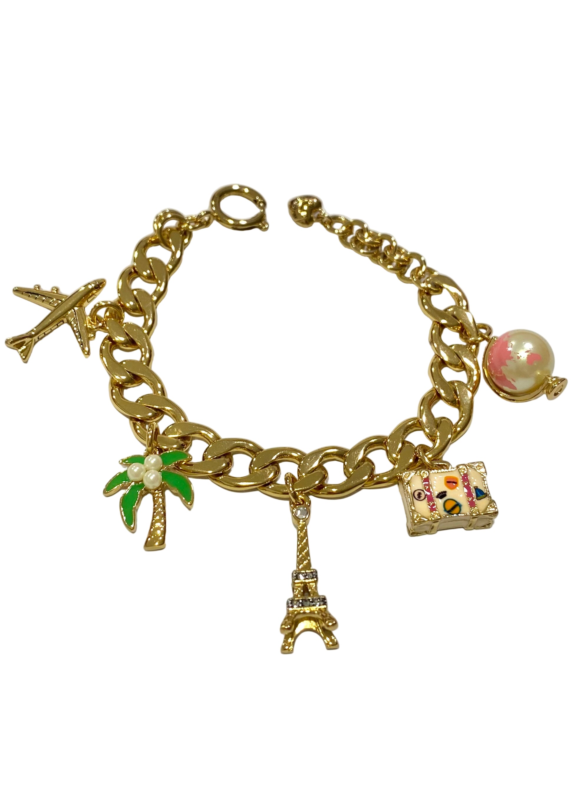 Complete your OOTD with this dazzling accessory that adds sophistication on your style. Golden bracelet with charming jet setter theme elements. A product of Juicy Couture.