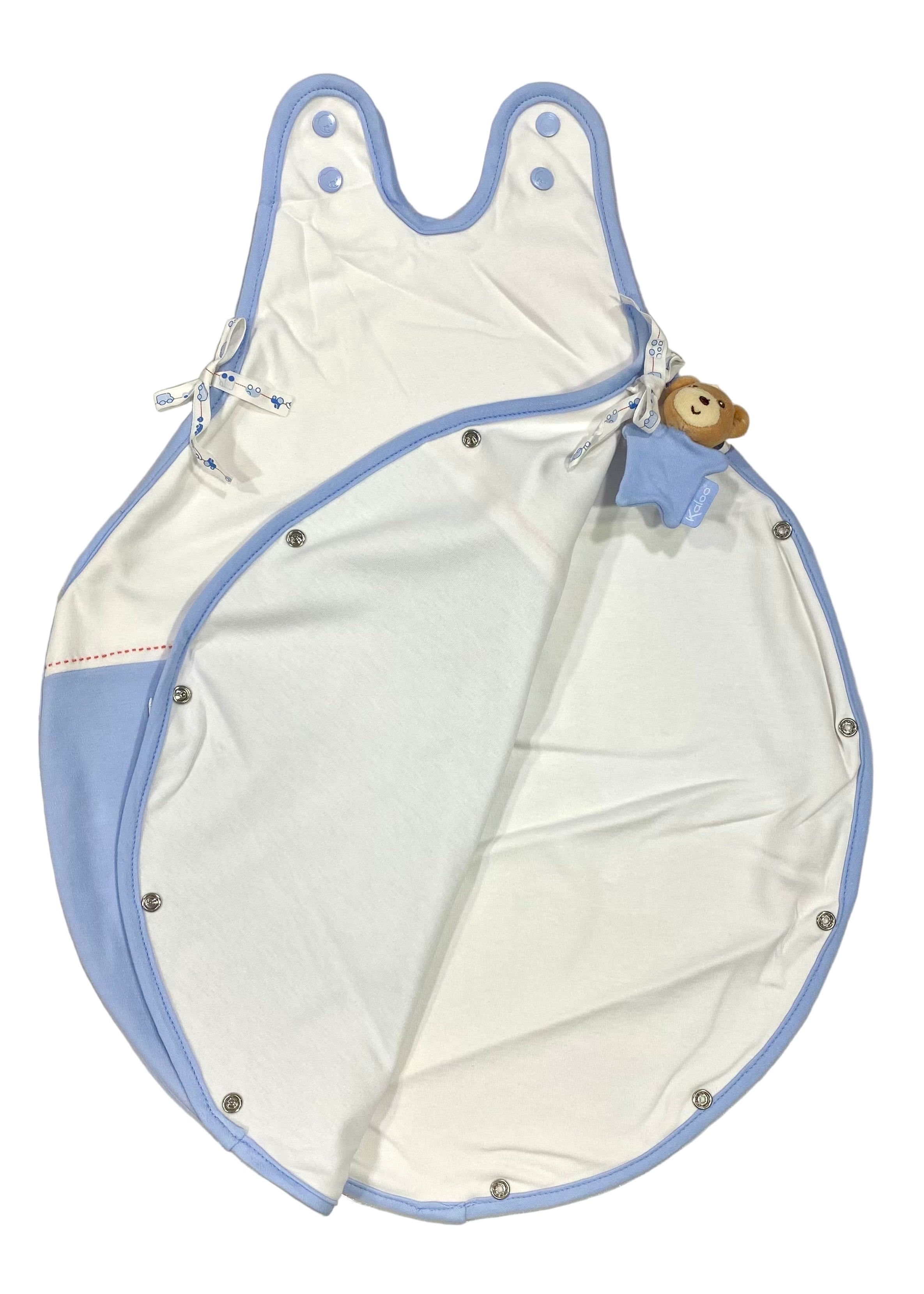 Blue sleeping bag by Kaloo that is made of 100% cotton. A car patched on the chest. It is fasten on shoulders and side with snap buttons.