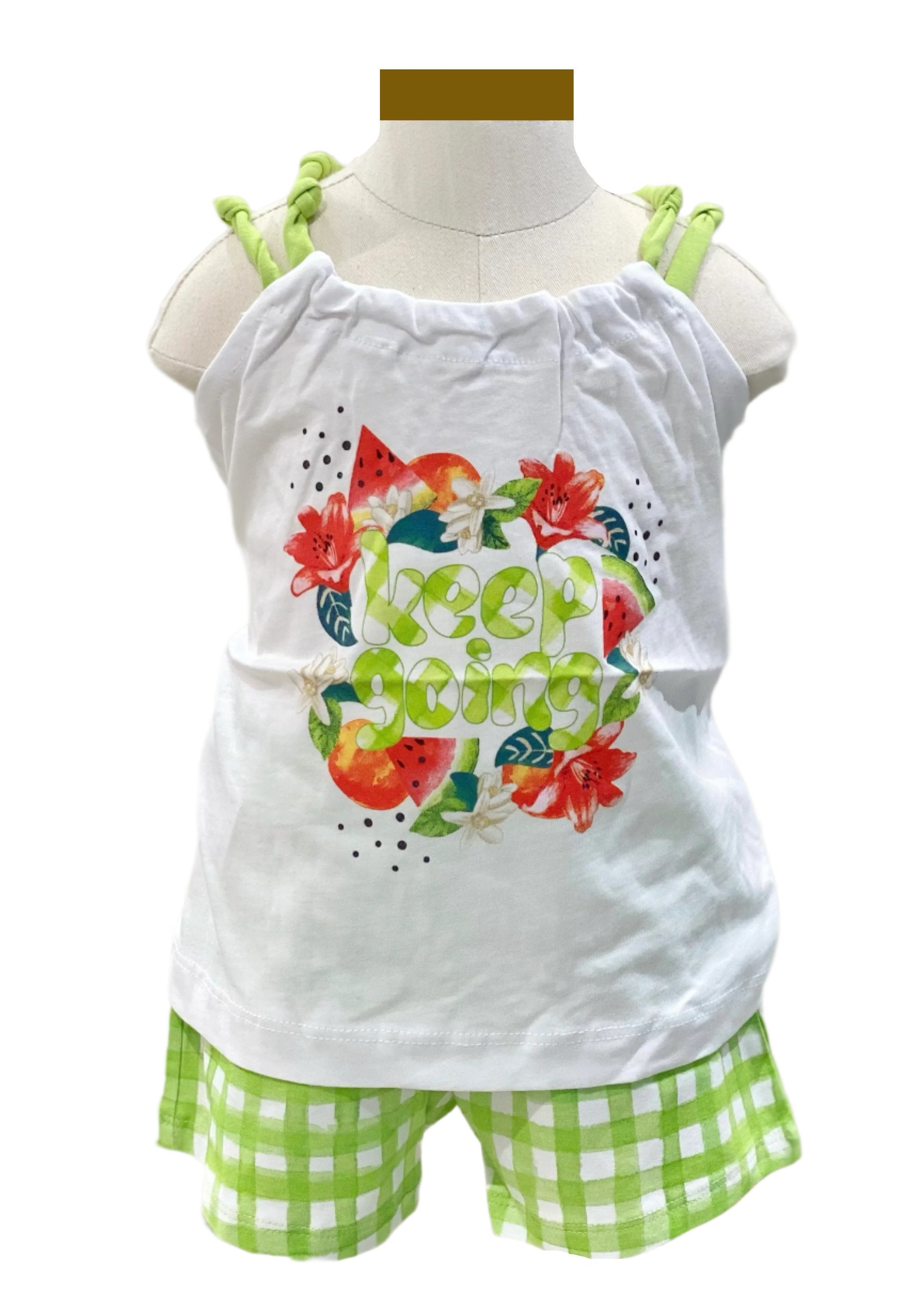 Cool girl's outfit set. The top has double strap with knots, it is printed with 'Keep Going' writing, fruit and flower prints. It's matching short has checkered pattern design, soft and has an elasticated waistband.