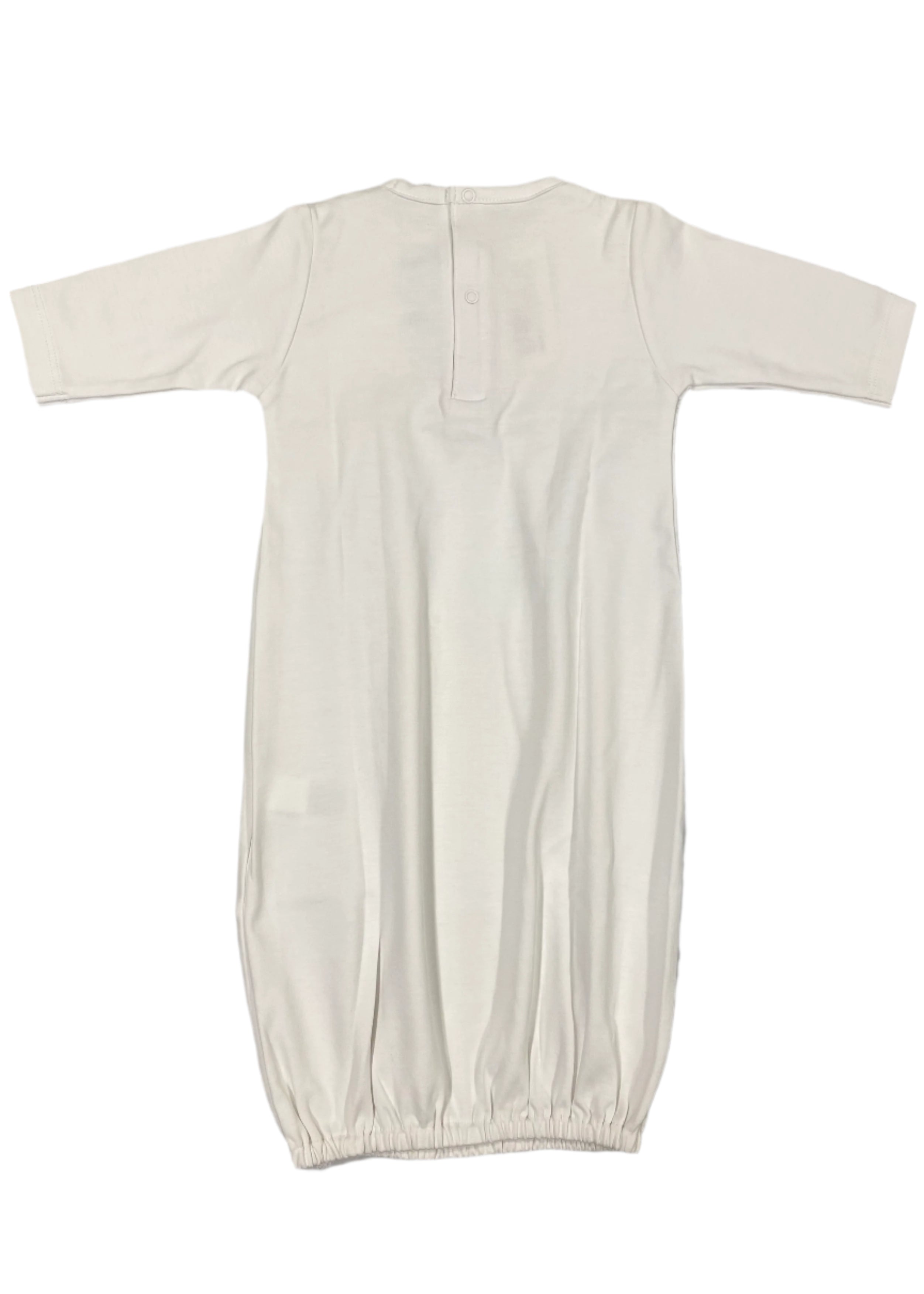 This white babygown from Kissy Kissy is made in super soft pima cotton with an embroidery style across the chest and pleating details down the front. It has fastens at the back with poppers and has a stretchy elasticated hem, which provides easy access for
