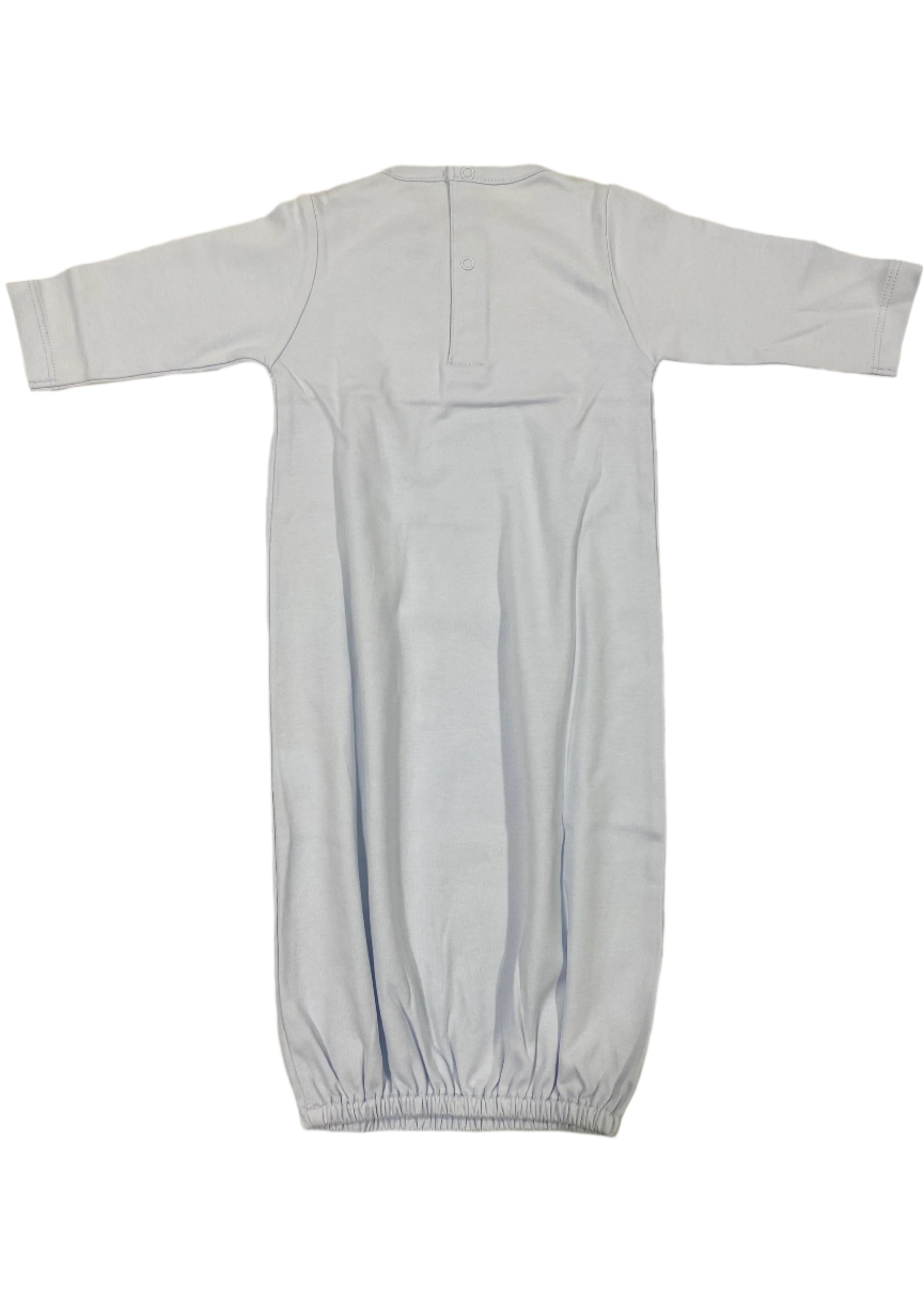 Plain blue baby gown by Kissy Kissy that is made of 100% Pima cotton. Pleated on the chest. A patterned crochet design on the chest. Fastened at the back with poppers. Elasticated hem.