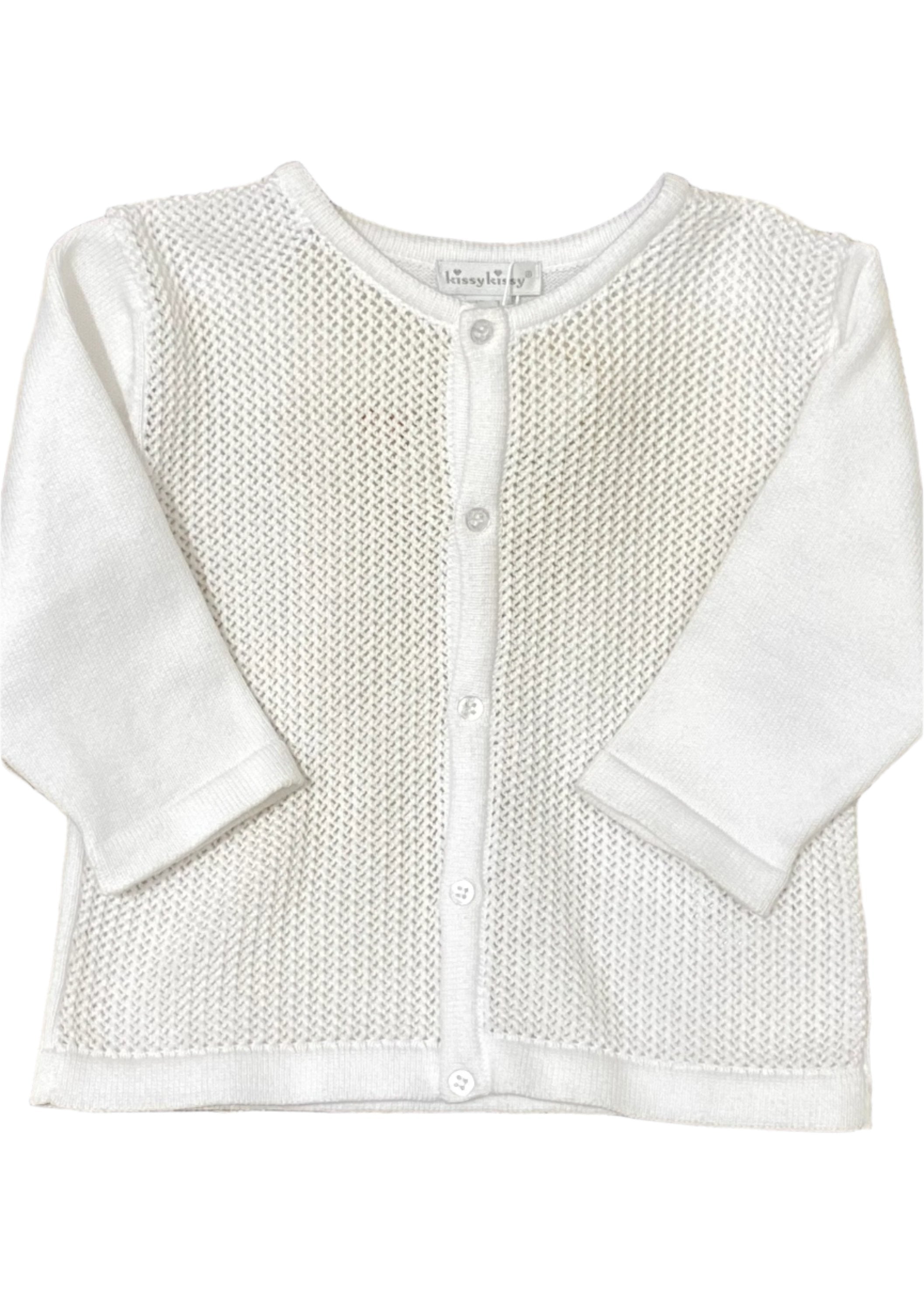 A white knitted cardigan by Kissy Kissy that is made of 100% cotton. Crocheted pattern design. Button fastening on the front.
