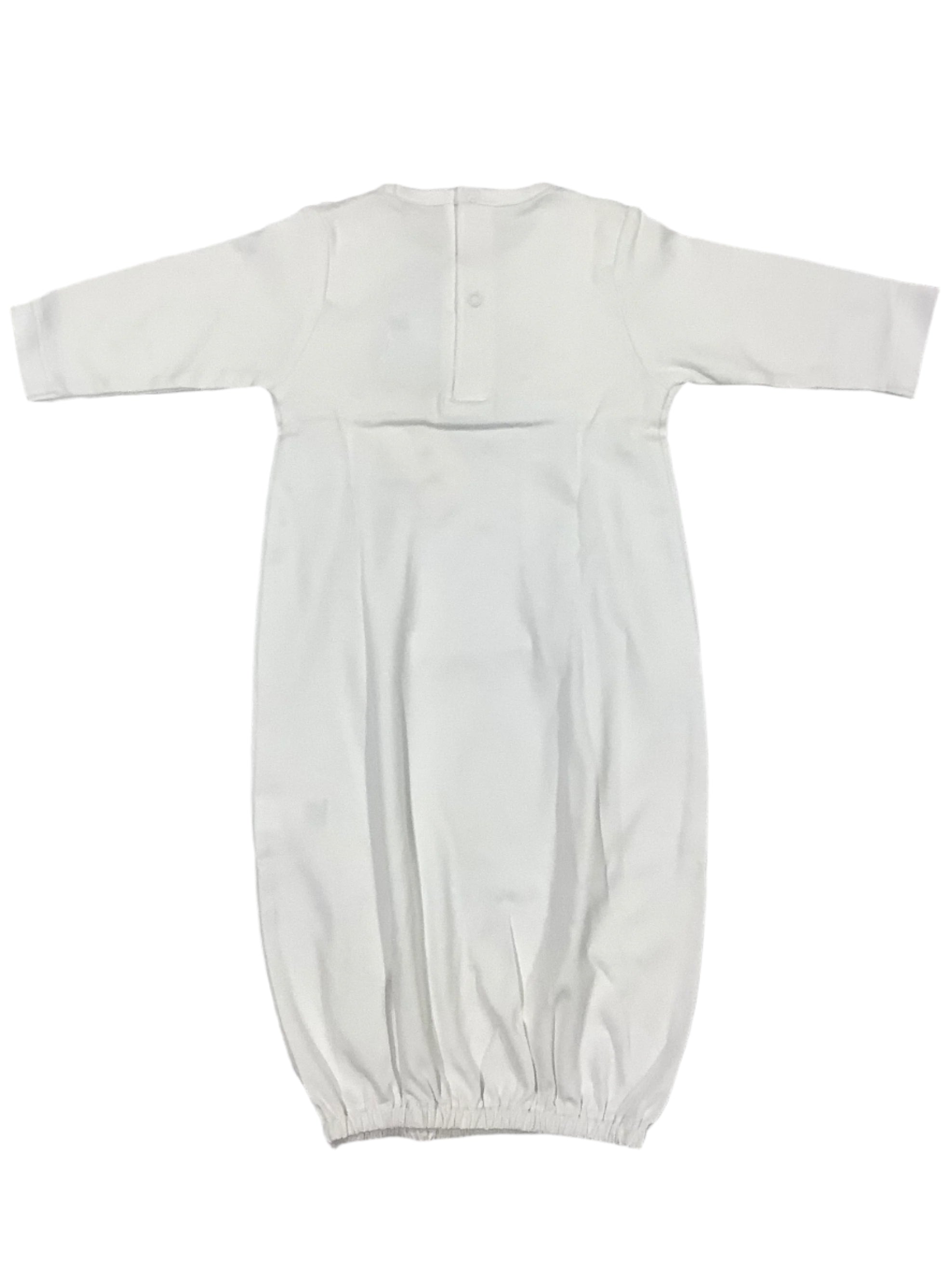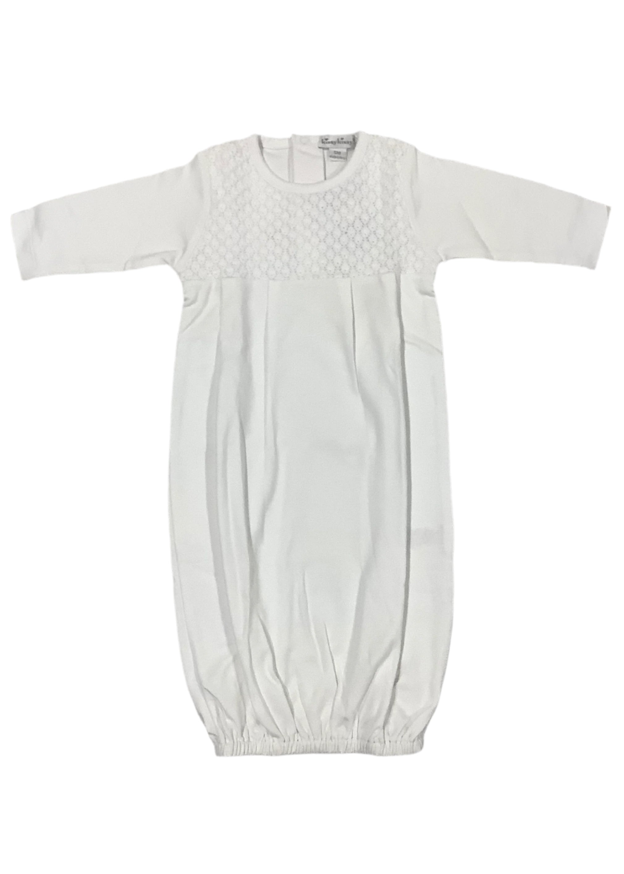 A simple white baby gowns designed with patterned crochet on the chest. Elasticated hem for easy adjustments.