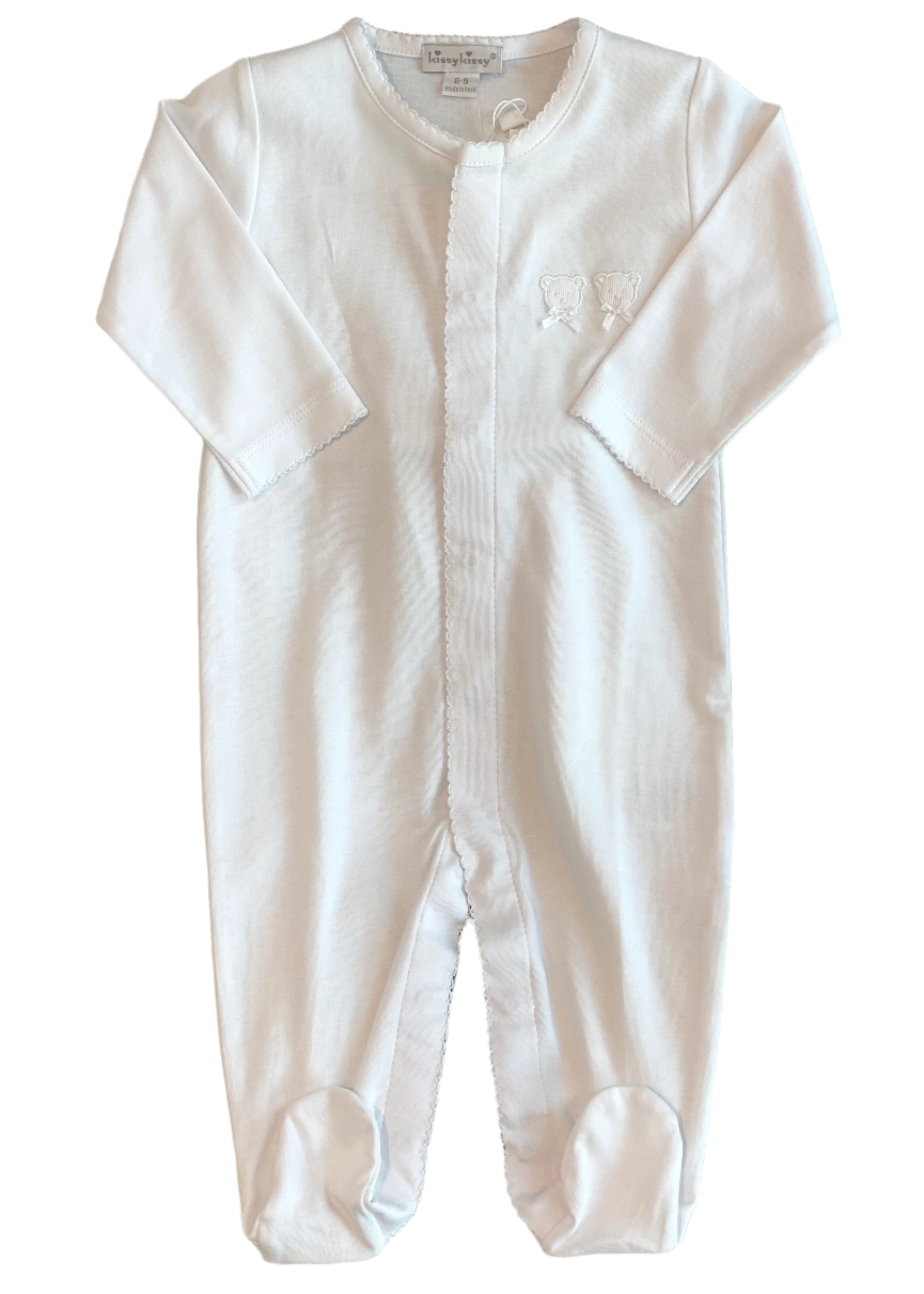 A simple white babygro. It has two applique bears with white ribbon bow on the left chest, a curled stitching around the neckline, cuffs and along the plackets. Has poppers for easy changing.