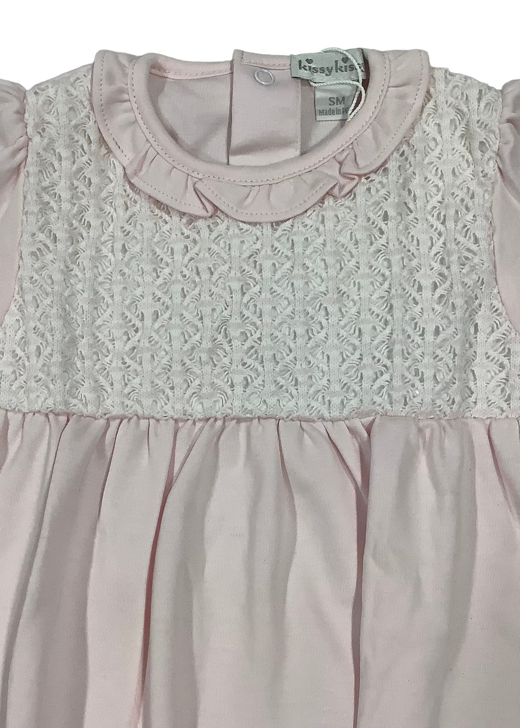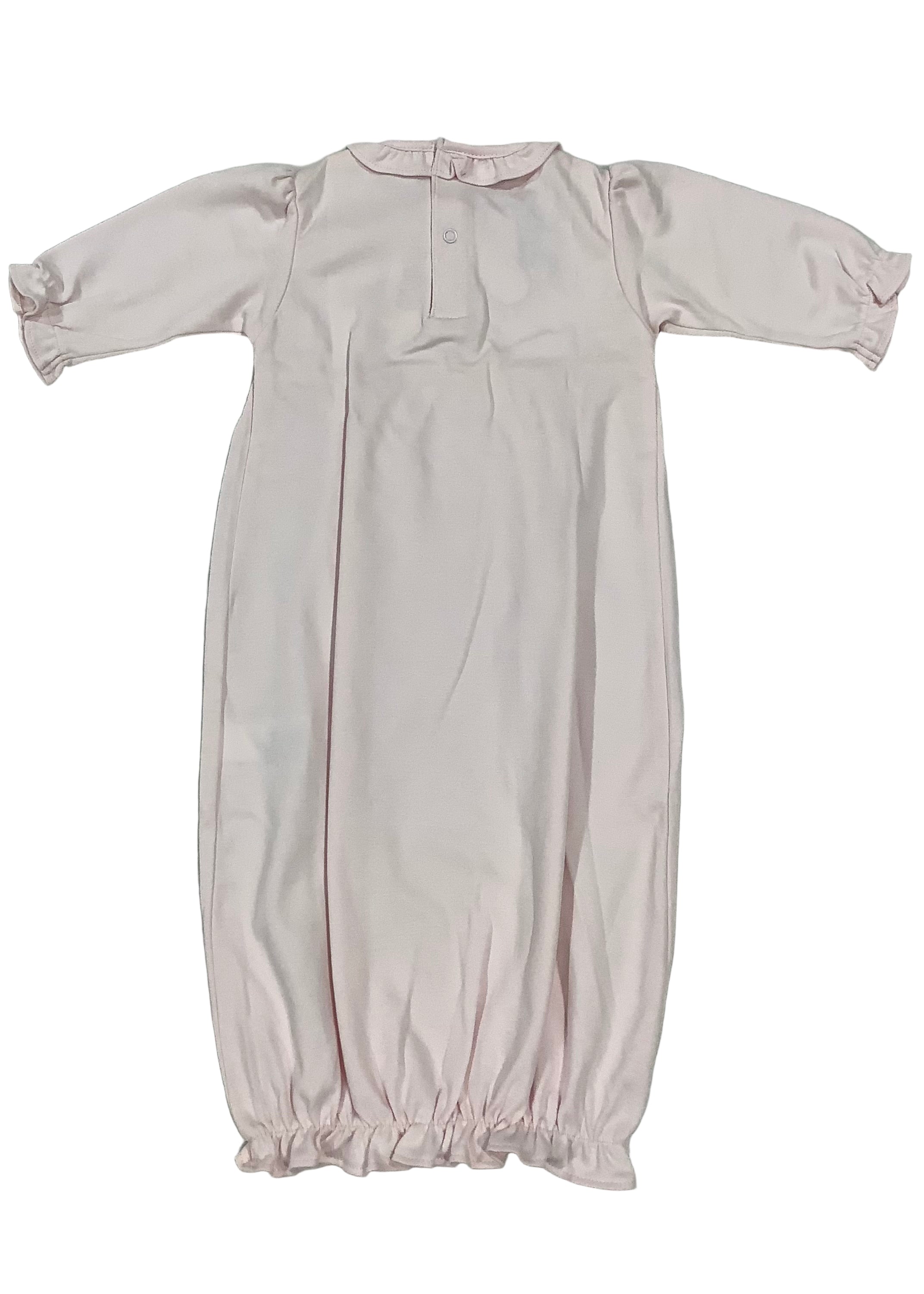 This pink baby gown from Kissy Kissy is made in super soft pima cotton with a knit style across the chest, a round frilled neckline and cuffs. It has fastens at the back with poppers and has a stretchy ruffled hems.