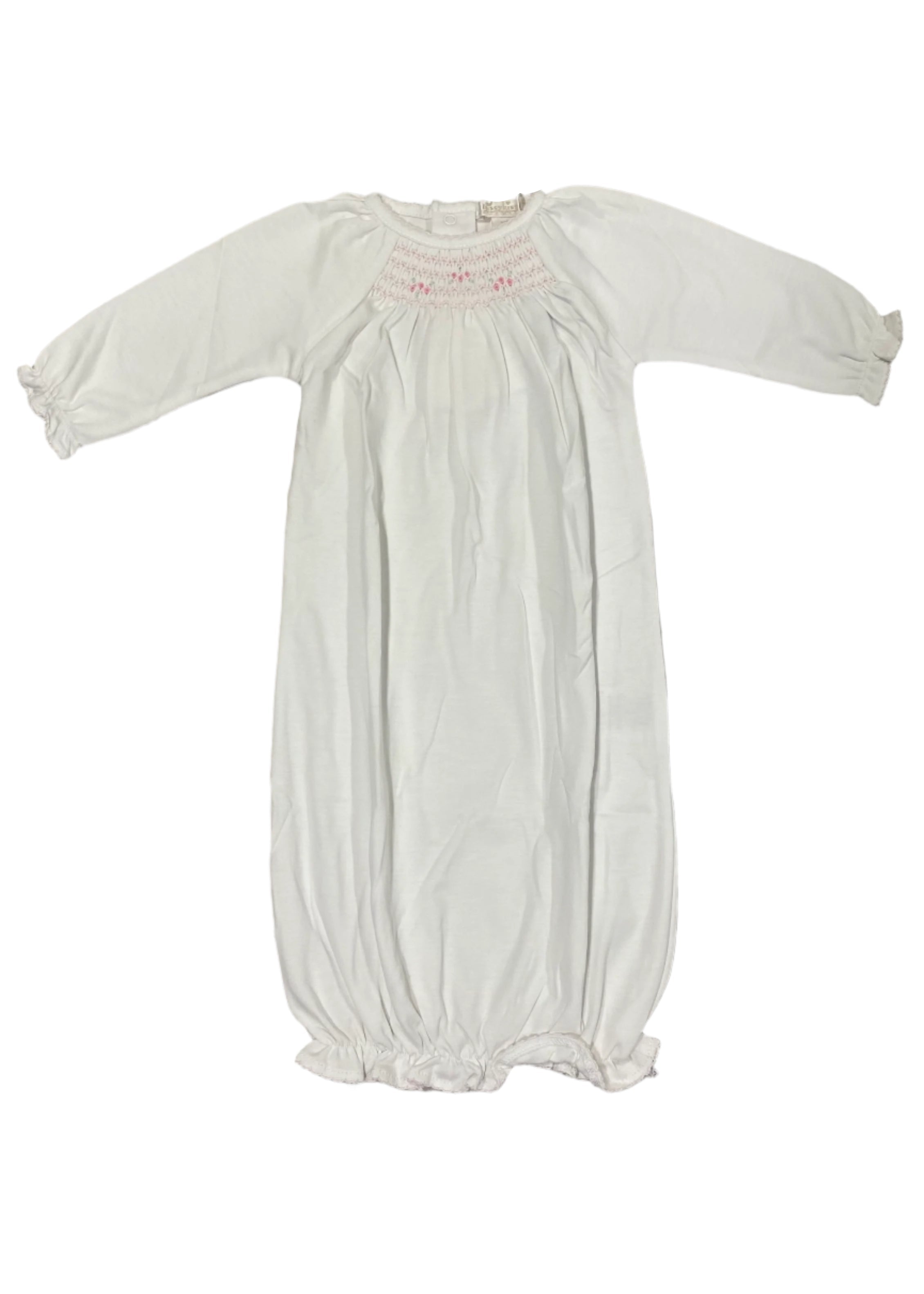 This white baby gown is made of 100% pima cotton. A smock embroidery at the chest and it has a small rose bud. At the back is fastened with snap. Elasticated cuffs and hem.