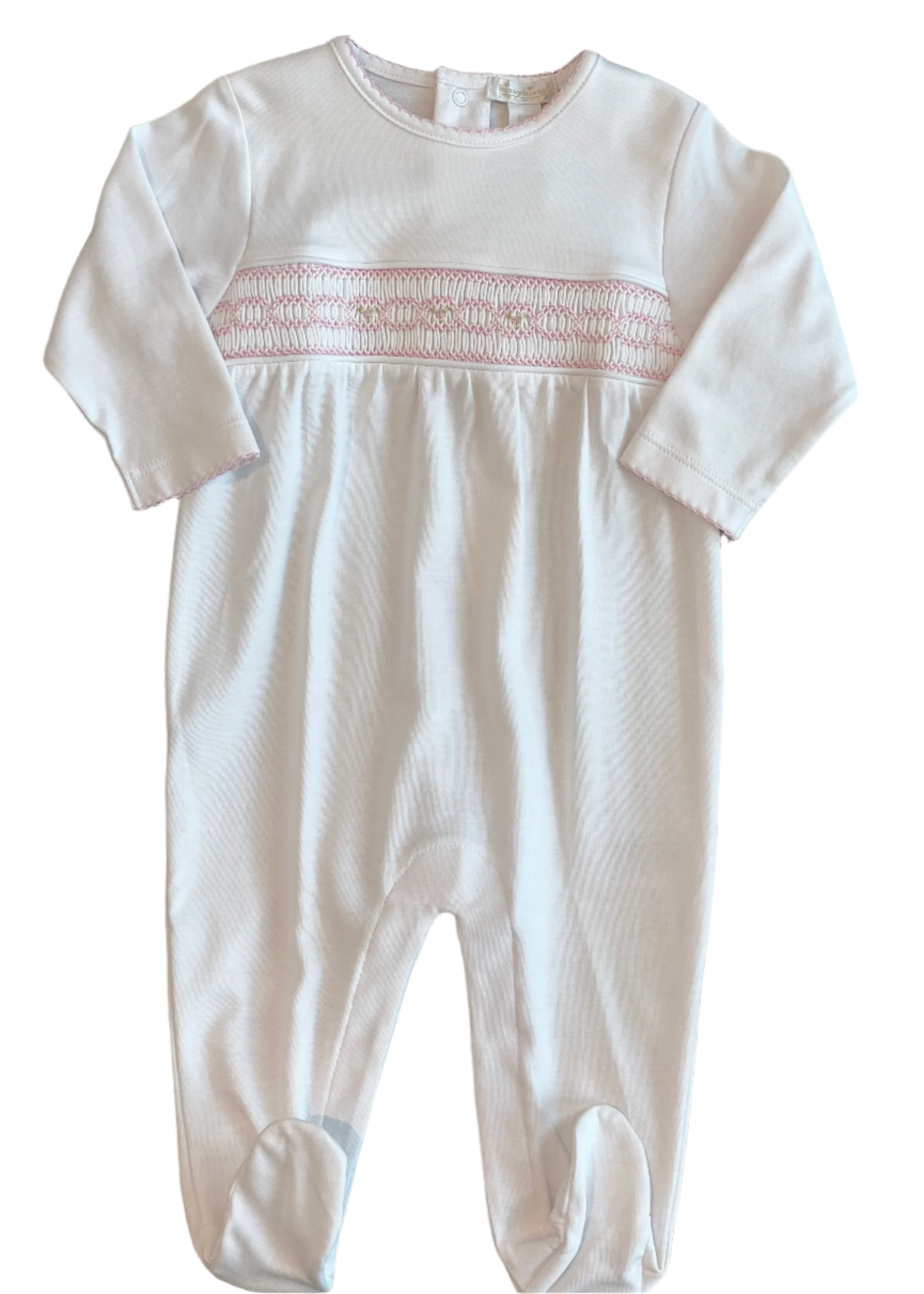 A white babygro from Kissy Kissy is made pima cotton. It has a hand-embroidered smocked on chest with a flower. The baby grow is fastened at the back and between the legs with poppers.