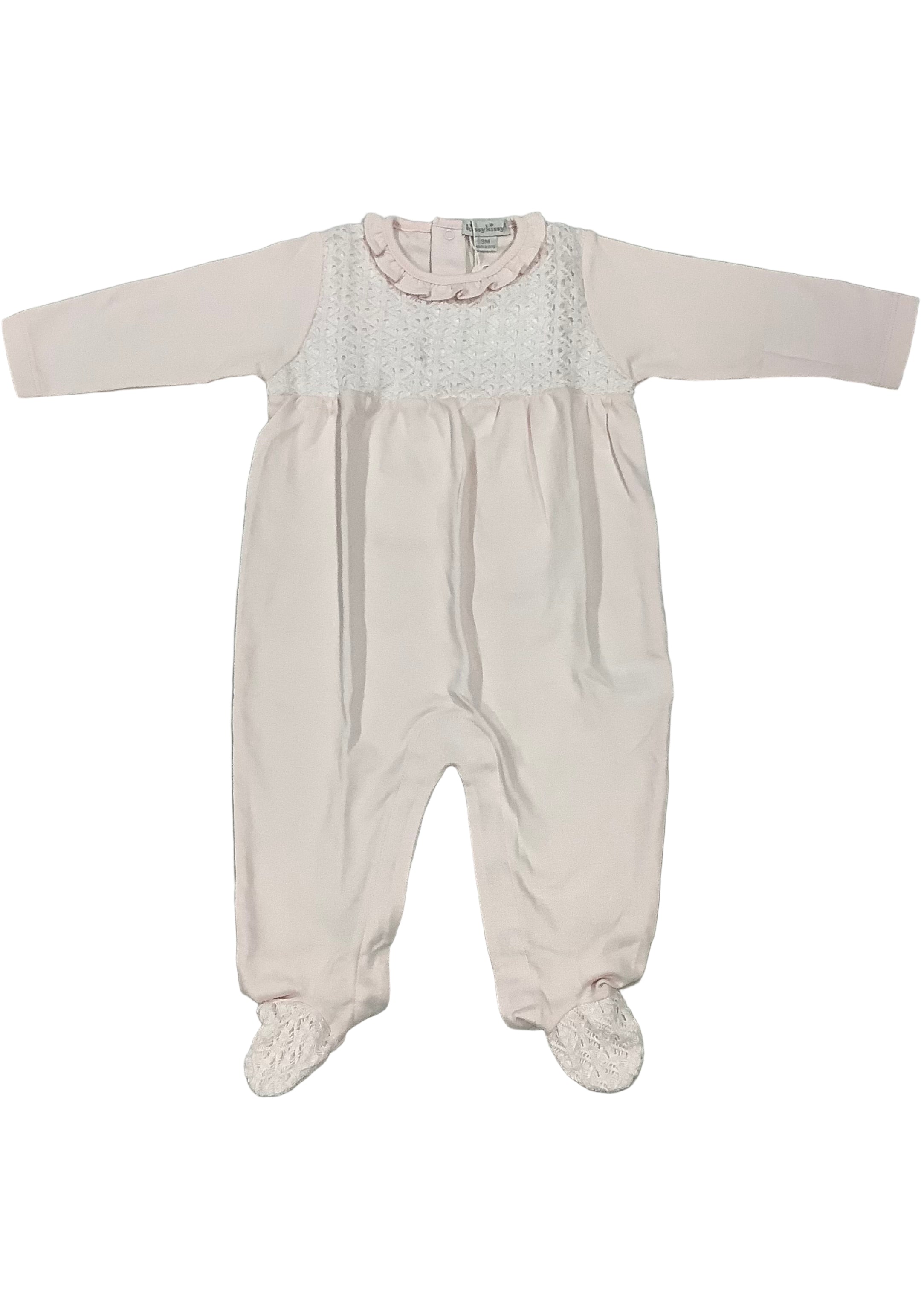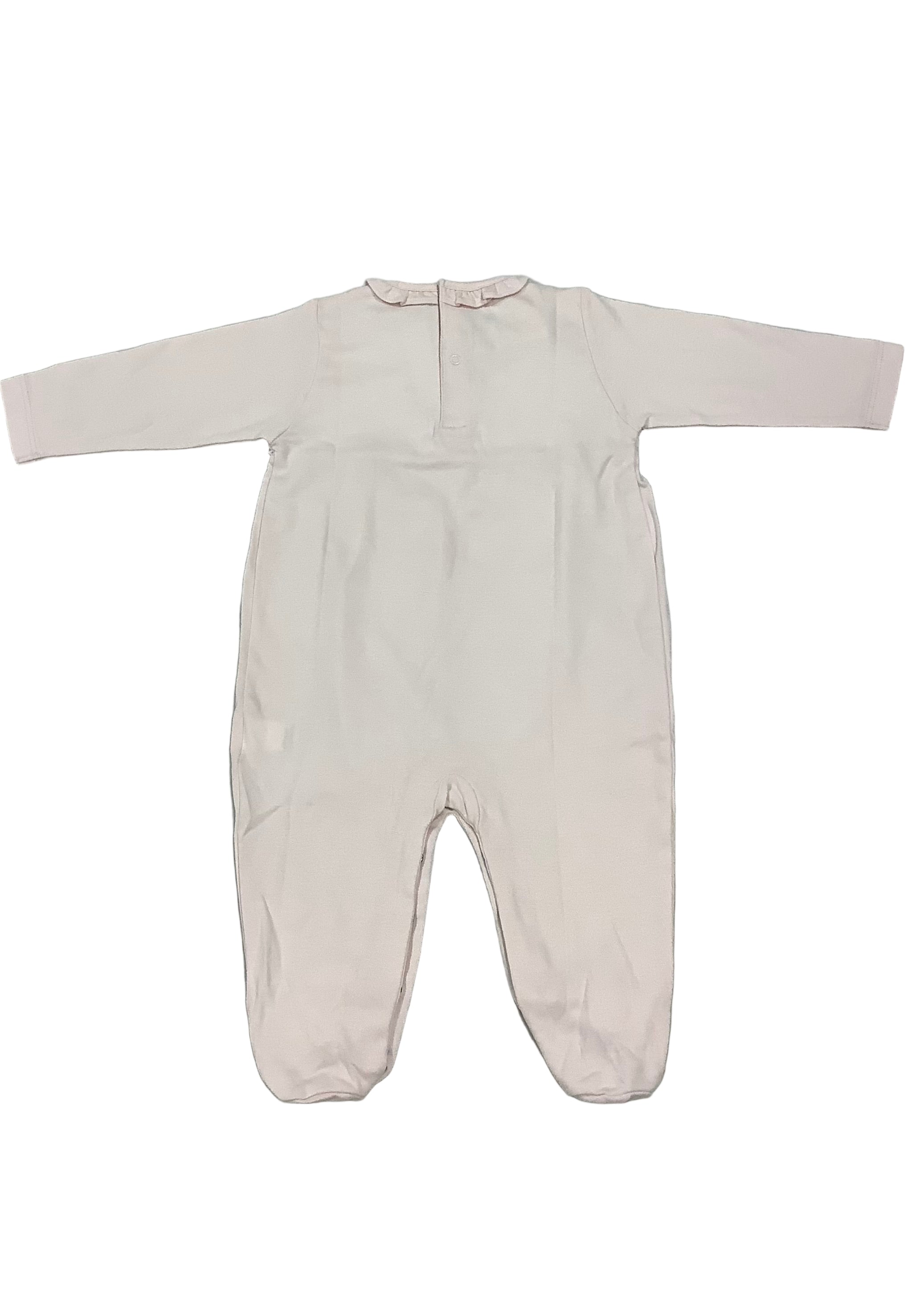 This pink babygrow from Kissy Kissy is made in super soft pima cotton with a embroidery style across the chest and on the feet, a round frilled neckline. It has fastens at the back with poppers for an easy wear.