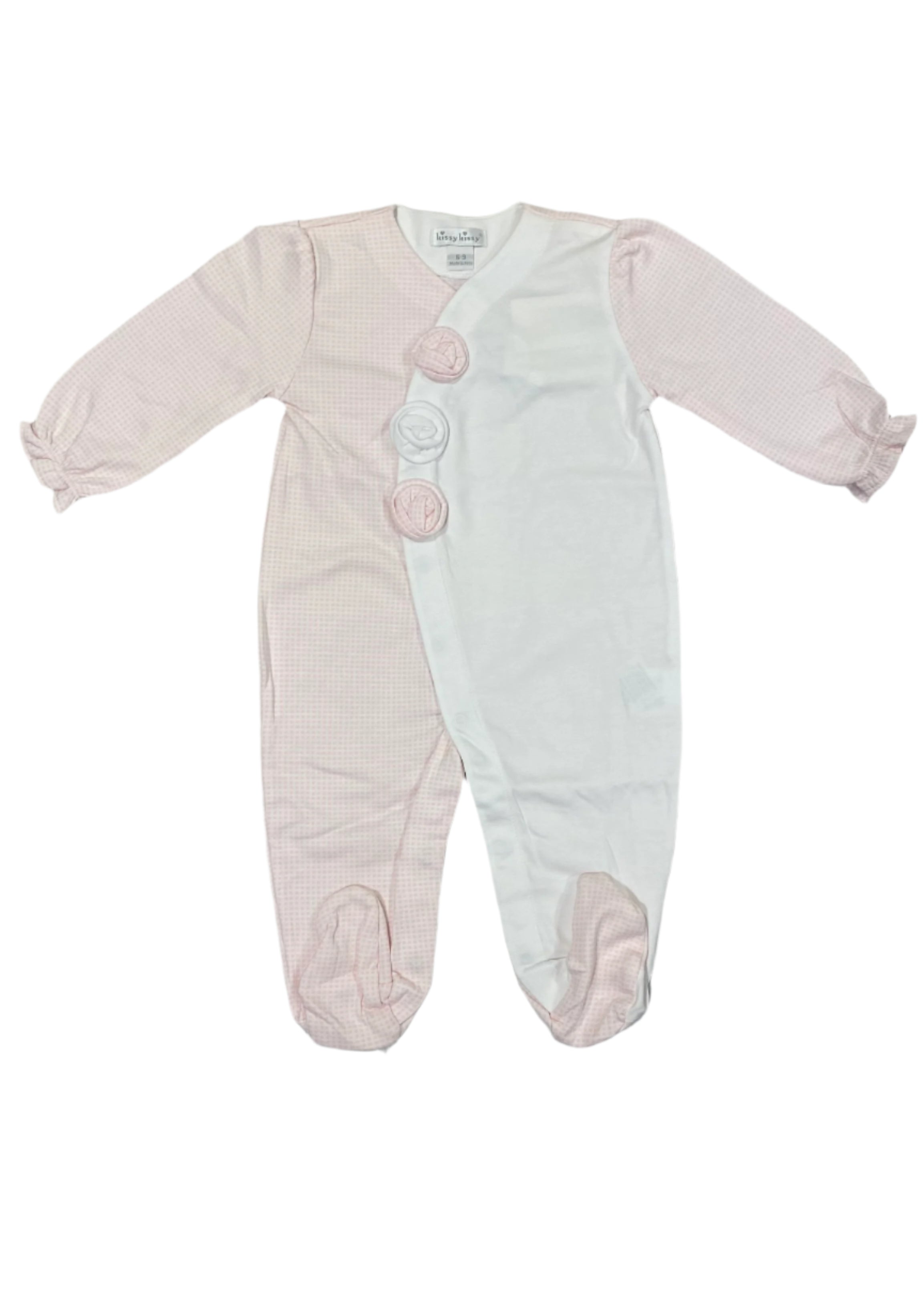 An open front babygrow with a three rose bud on the placket as the main design. Frilled cuffs. With checkered details. Full poppers in front.