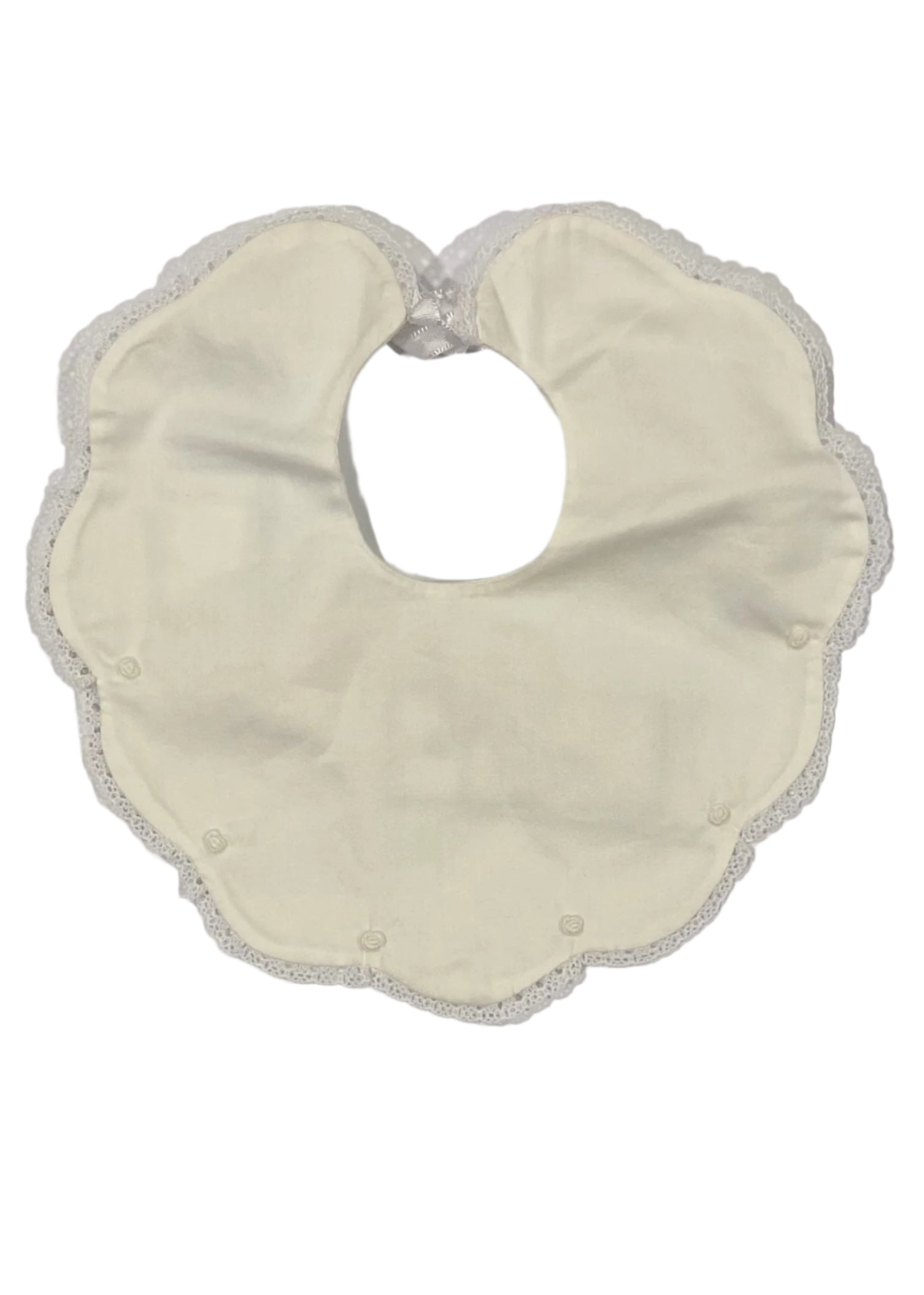 An elegant bib from KISSY KISSY. Exquisitely designed with white flower embroidery and is finished with lace on the edges. Secures with a silky ties.
