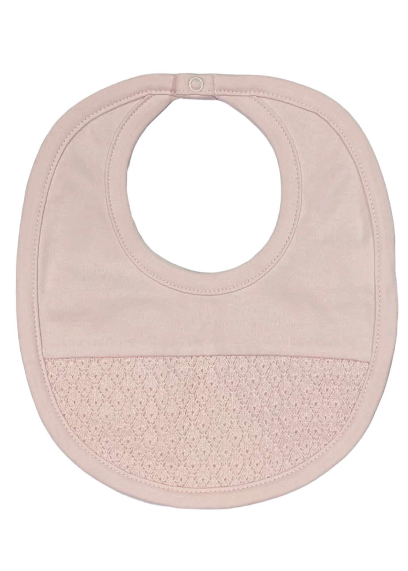 Plain pink bib by Kissy Kissy that is made of 100% pima cotton. It has a patterned crochet design. Fasten with snap.