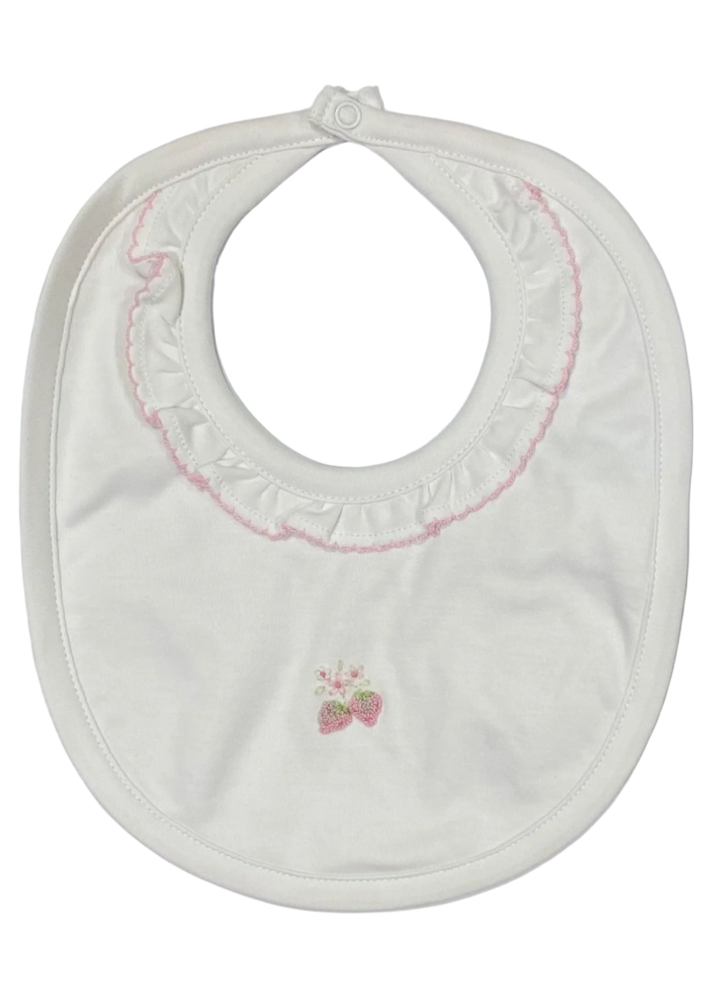 A white bib that has a ruffled design on the neck. It has a berries embroidered at the center. Fasten with snap. Made of 100% pima cotton.