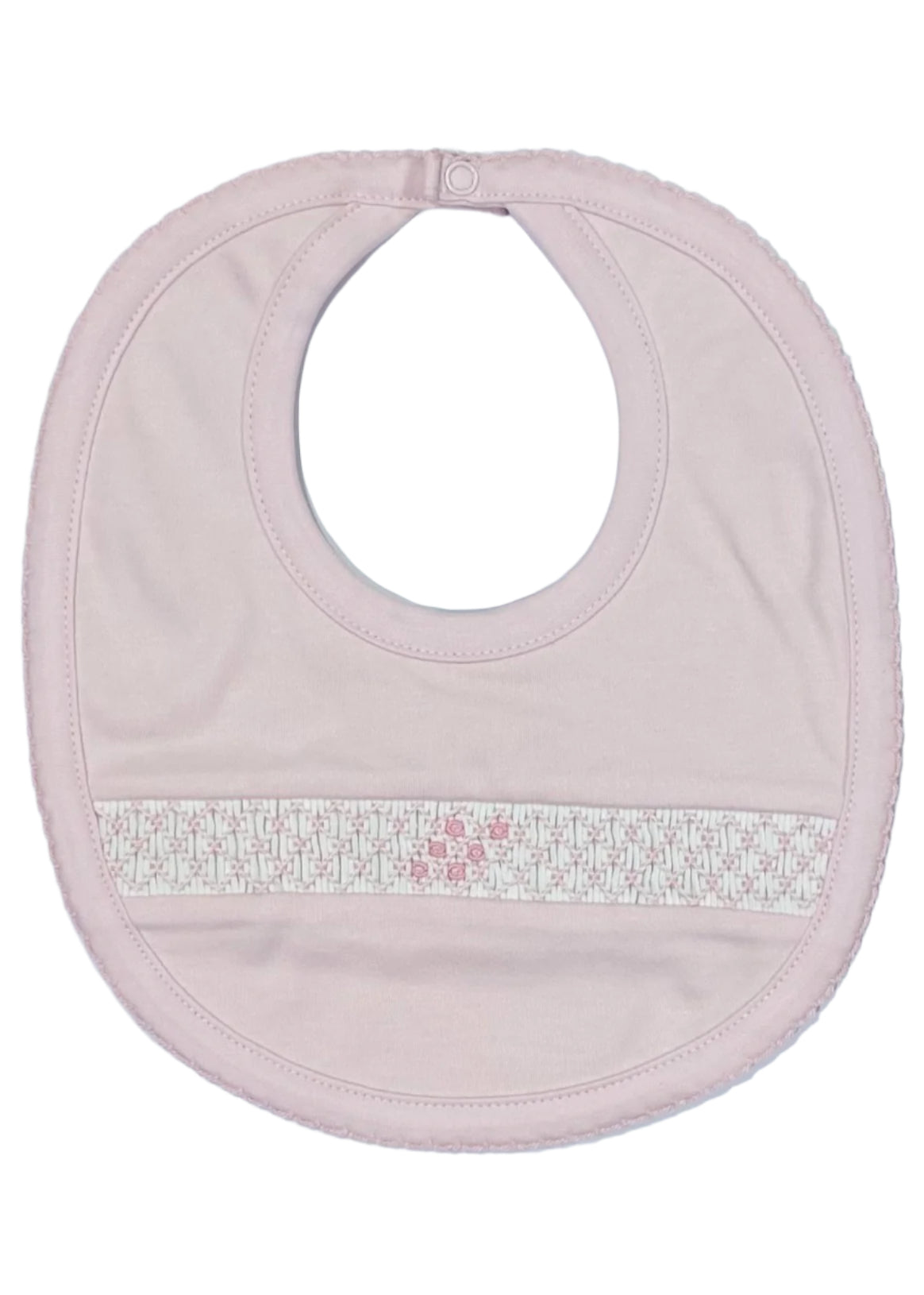 A diamond patterned smocked embroidery design. This bid is made of 100% pima cotton by Kissy Kissy, it has a small pink embroidered at the center. Fasten with snap.