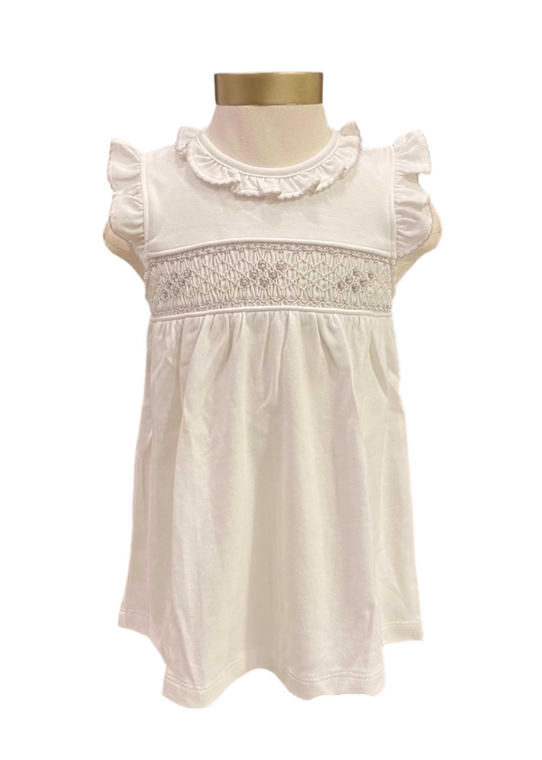 This pretty white dress is made from a 100% pima cotton. It is soft and very comfortable to wear. With a grey and white embroidery details across the chest, it has a round ruffled collar and sleeves. Matching diaper cover with elasticated waist and legs.