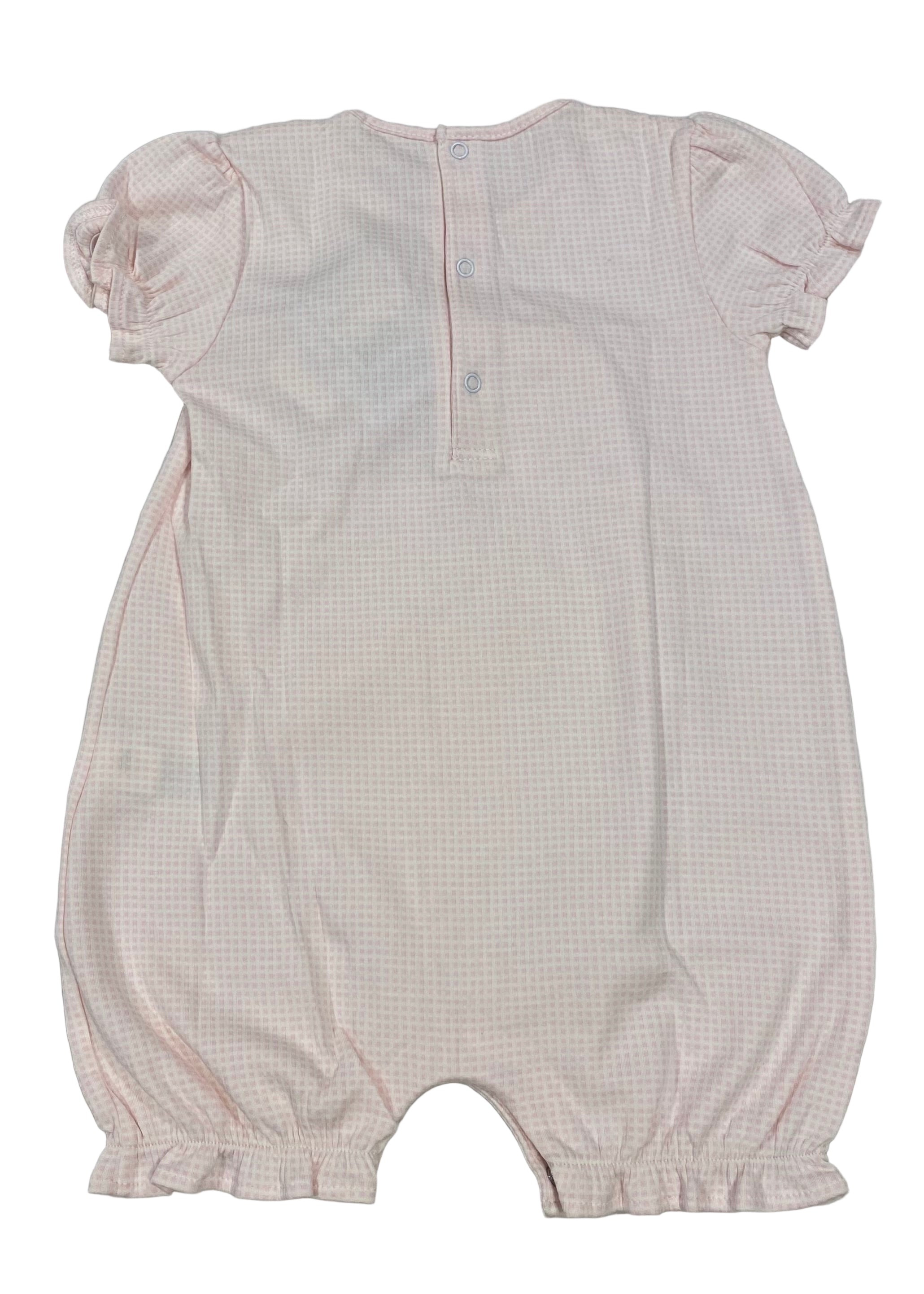 An adorable shortie made with soft pima cotton. It has elasticated cuffs and legs. Short sleeves. Poppers at the back and in between the legs. Round neckline. A three rosebuds on the chest with white background.